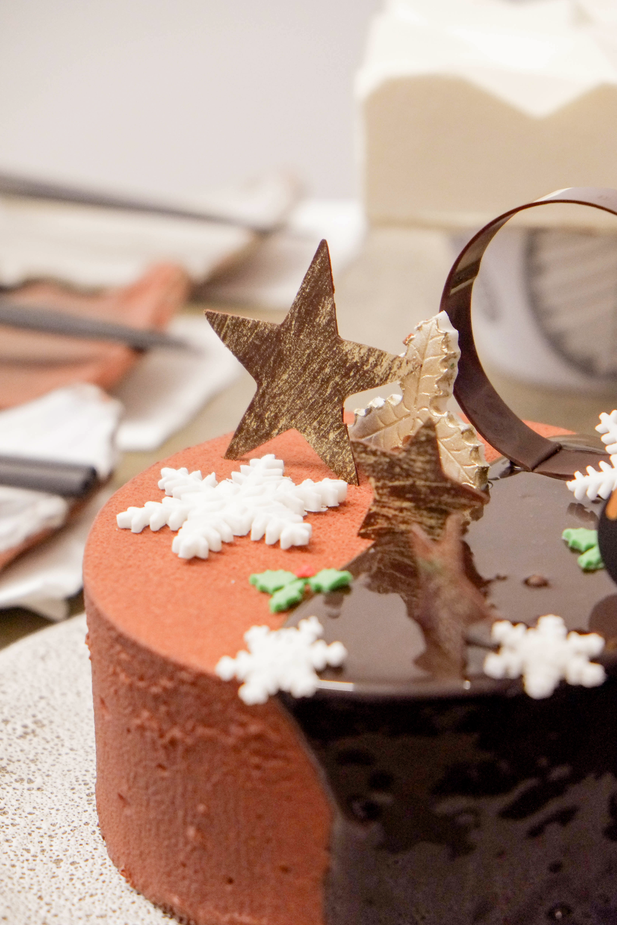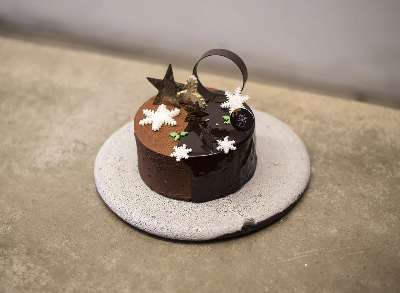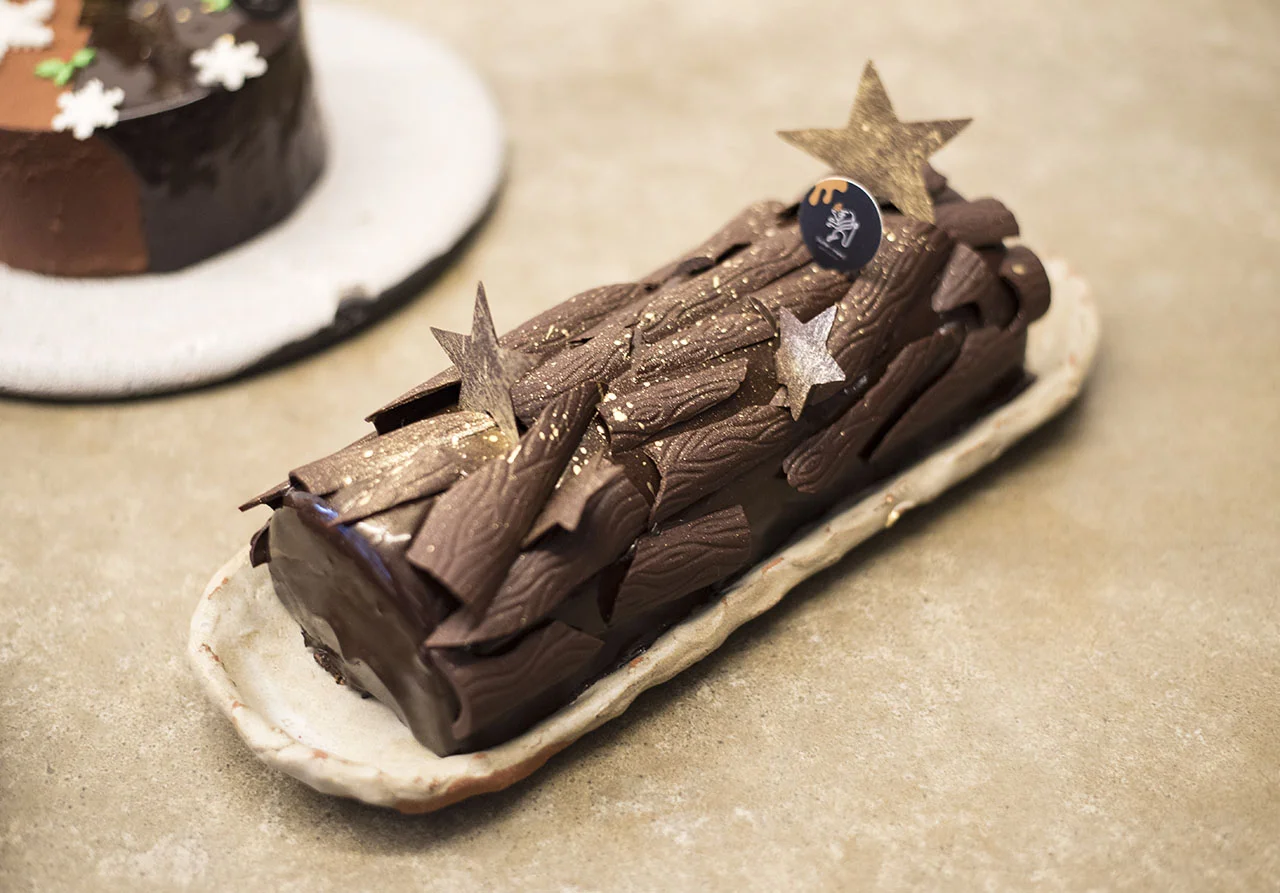 One has to spend time admiring the craftsmanship that goes into the presentation of the Yule Log cake. The chocolate pieces are carefully placed to create the log texture, delicate gold flakes and hand drawn stars complete the festive look.