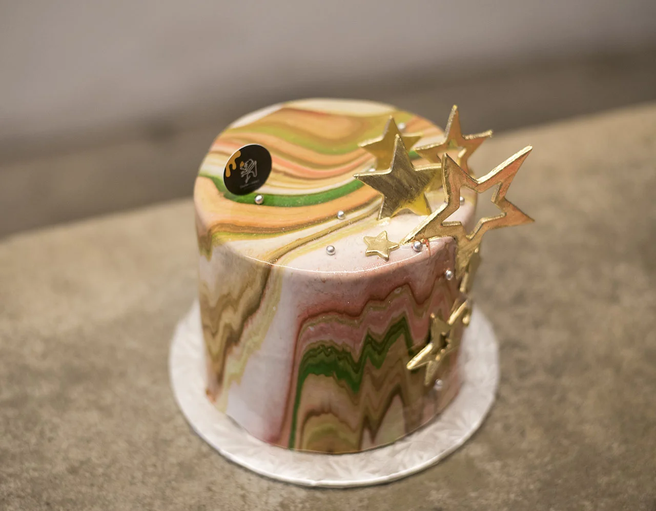 Mirror cakes have been all the craze, and this is truly one of a kind with its mesmerizing array of colours. Just a look at the design reminds us of the festive season.