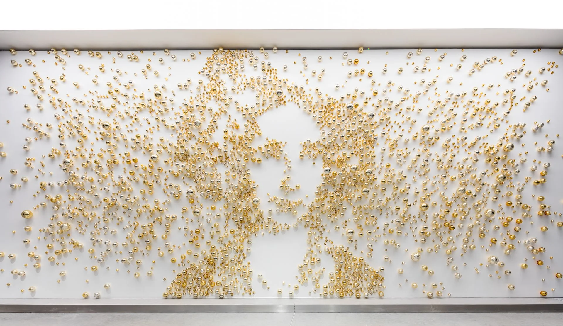 Over three thousand glass bubbles had to be made to create each portrait. They were then placed on the interior walls and assembled into a seemingly random constellation of dots which, upon closer look, reveal a concrete image.