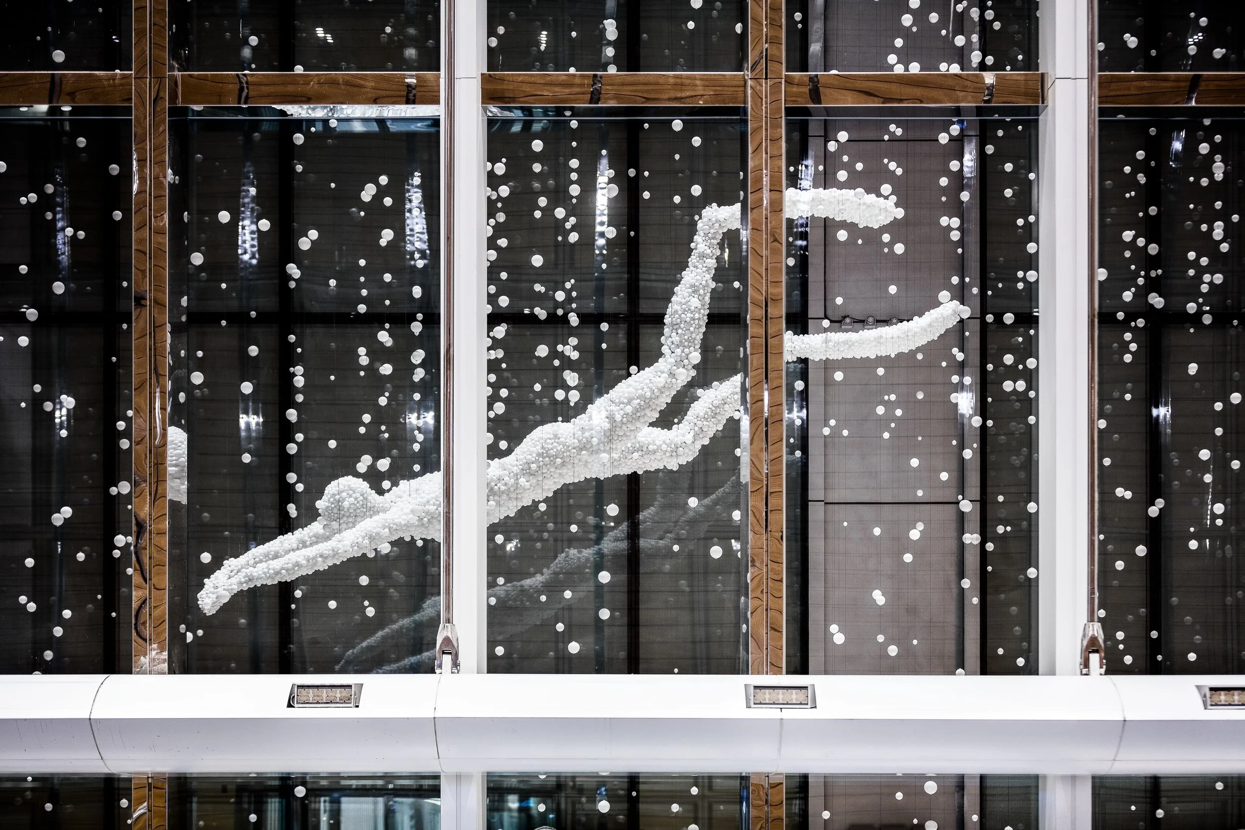 Lotte World Tower is a 123-floor, 555-metre skyscraper in Seoul, South Korea. Its silhouette has quickly become one of the city’s modern-day icons. The astounding height of the building lobby is the perfect ground for this whimsical installation, where 18-thousand monochromatic white glass bubbles are hung at varying heights to resembles air bubbles surrounding the key installation piece - a female diver diving into the depths of the ocean.
