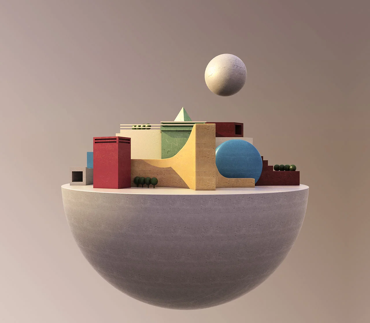 F: "What's on the other side Ray?" For those paying close attention, it's actually already given away in the title. This work is an homage to one of the works by Italian artist Ray Oranges. When I first saw this 2D illustration I immediately thought it would be nice to model this in 3D and explore what could be lying inside such a world. I started a couple of years ago and then abandoned it for a long time due to working all sorts of jobs in order to pay the bills. Not long ago, I finally picked up where I left off and had to make all sorts of decisions on how to finish the project, for example the people, trees and cars should look like. For the whole overall look I chose as inspiration a brief design movement in the 80's called "Memphis", which I believe consists mostly of furniture. For the cars, I initially had a way more complex 3D execution in mind, but then decided on bare minimum abstraction, and applied this to the trees as well. For the people I had a sort of cubism graphic style in mind. When I finally finished it and posted it on my Behance page it unexpectedly got great results due to Behance featuring it in their illustration gallery.