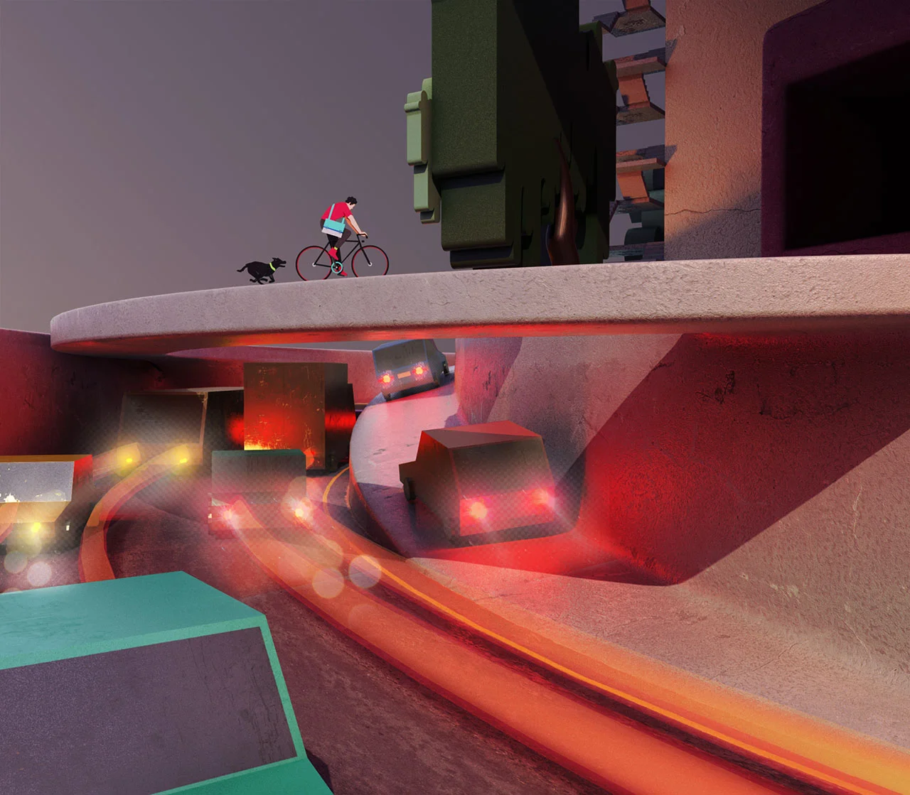 F: The most fun part of this project was placing the cameras. It's a great way to explore the dimensions of the world you created and brings them all together. Sure, some shots do not work as well and others are way better than you ever could have hoped for. I decided only after placing the camera to put in the guy on the fixed gear bike with the dog, also I admit he is way more naturalistic than the other characters; somehow I always have a style war going on in my work, I just do not want to commit to one style only, maybe its weak, but whatever it may be, it’s a great feeling of freedom.