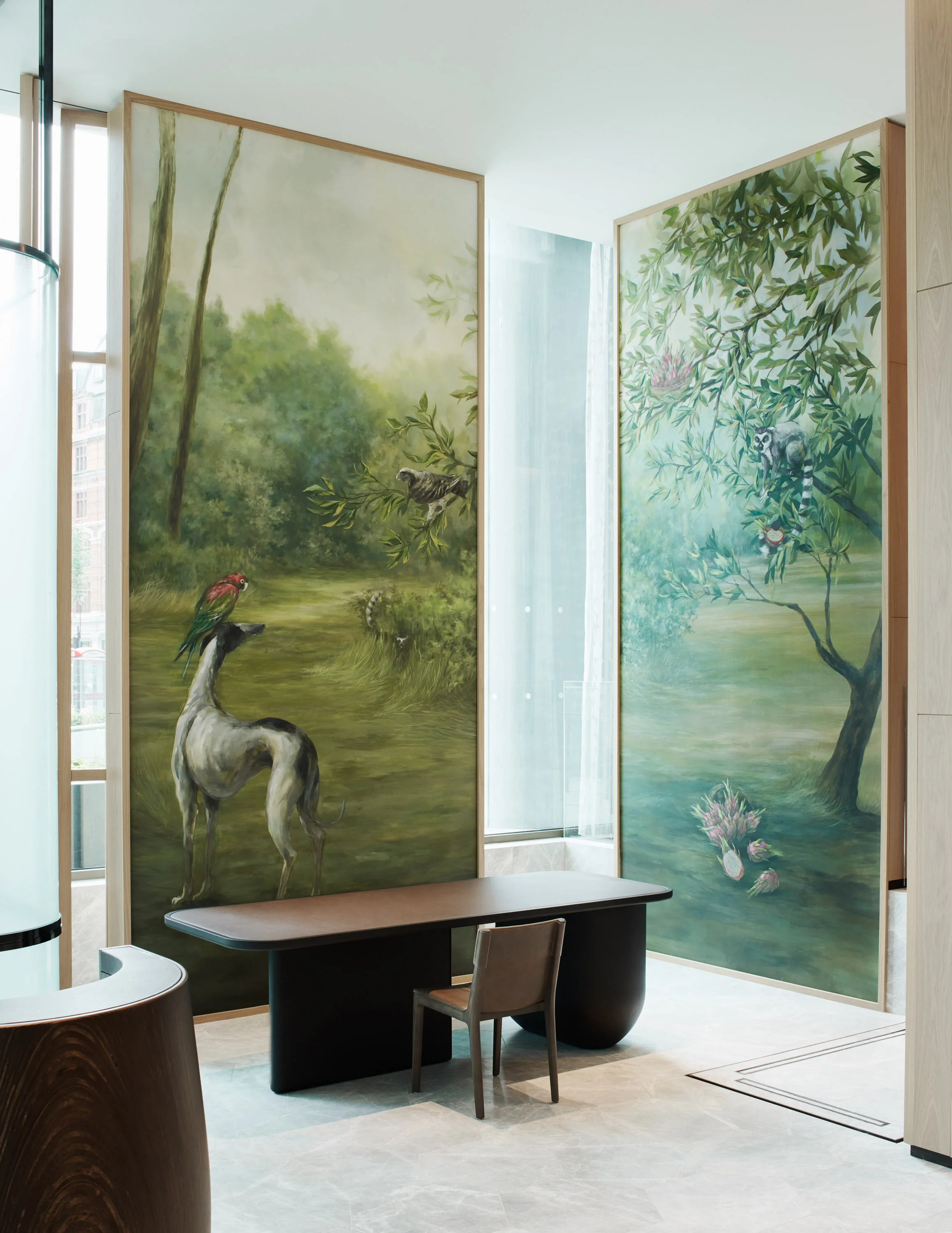 In their signature whimsy, the multidisciplinary atelier adds a visual narrative to the ultramodern interiors at the Pan Pacific that pays homage to national cultural icons William Shakespeare, J.M.W. Turner and Sir Joshua Reynolds. The hotel’s majestic reception welcomes guests to an enchanted setting beautifully rendered in a large-scale mural featuring a greyhound and a parrot engaged in a philosophical conversation with other animals.