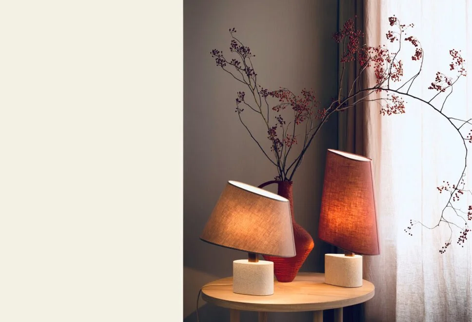 In the 'Sibylle' collection form pursues colour and colour pursues form in a perpetual sensory game — the bidimensional game of the wall hangings and of the kimonos but also the tridimensional game of the asymmetrical lampshades, which diffuse an enveloping and even mysterious light.