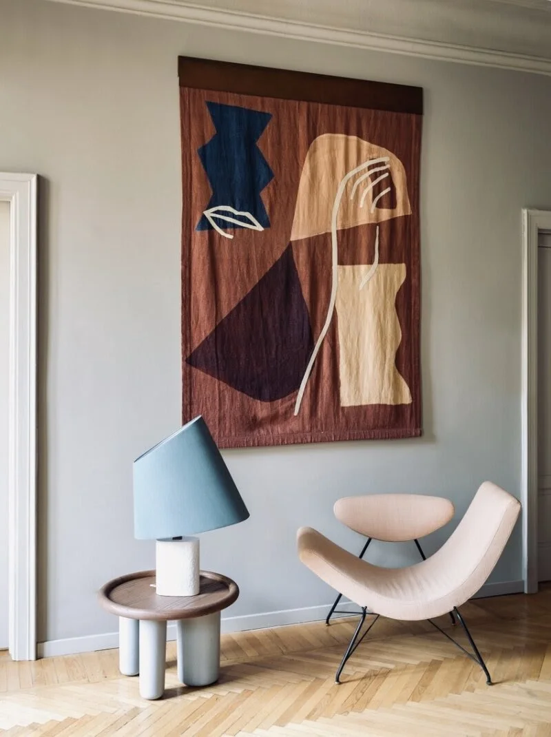 The collection consists of bedding, embroidered pillows, lamps with asymmetrical lampshades, wall hangings and flowing kimonos that envelop and protect the wearer, opening them to the world and its infinite possibilities.