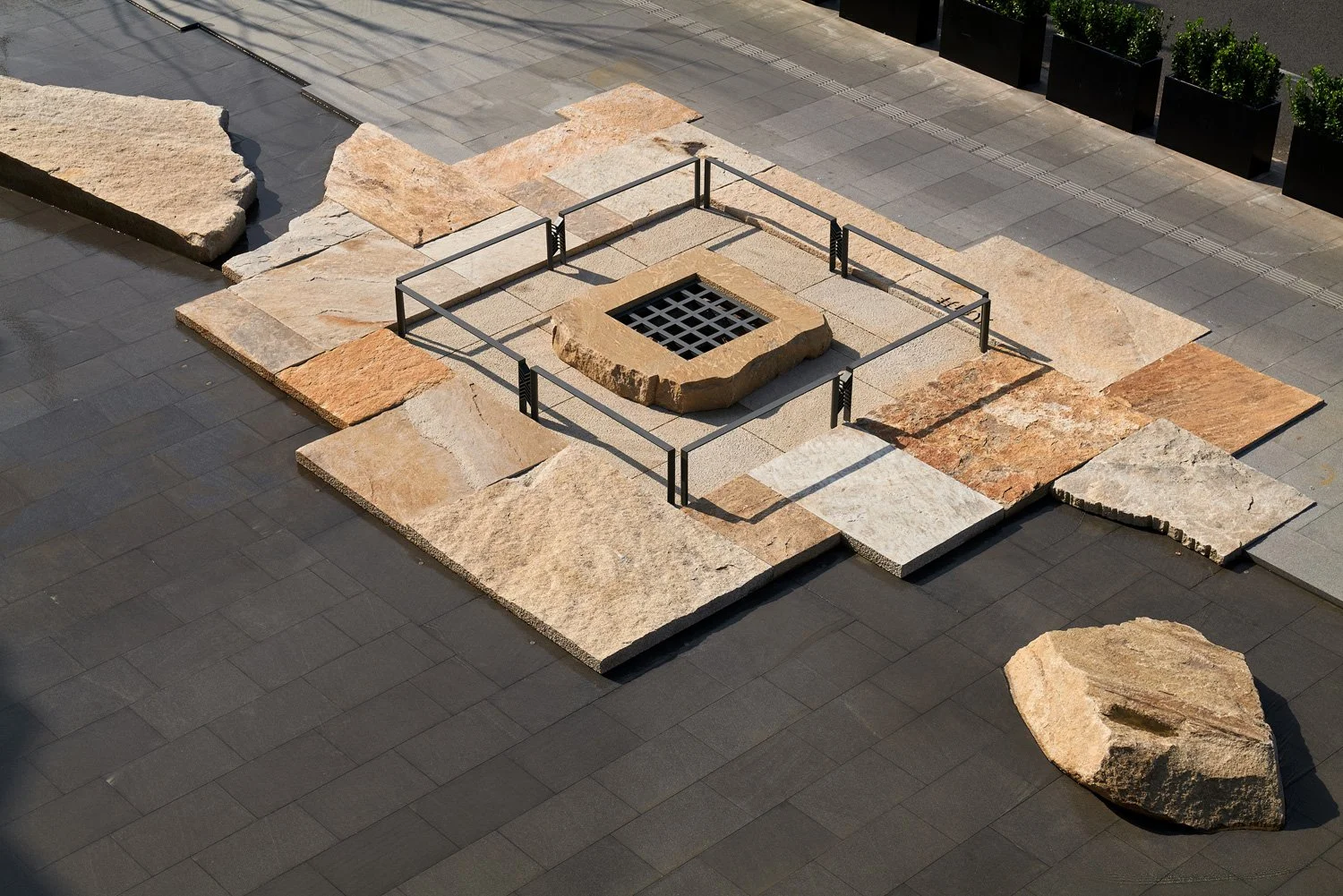 From above, the site resembles a fractured stone surface. Paving stones radiate outward from the well in a gesture that evokes the slow drift of the Earth’s continents. With careful variation in proportion and height, each piece of stone appears deliberate, as though part of an ancient narrative encoded in material. The resulting texture invites both visual contemplation and physical engagement.