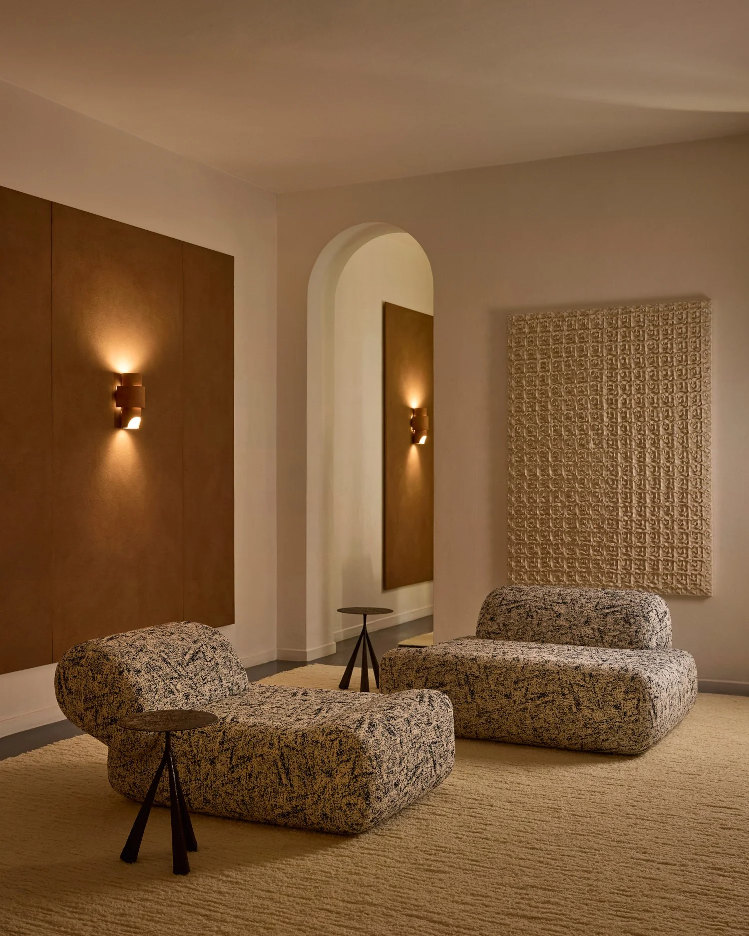 Sculptural yet welcoming, the TIO armchair and LOB table set the tone for VELOURIA’s tactile vestibule.