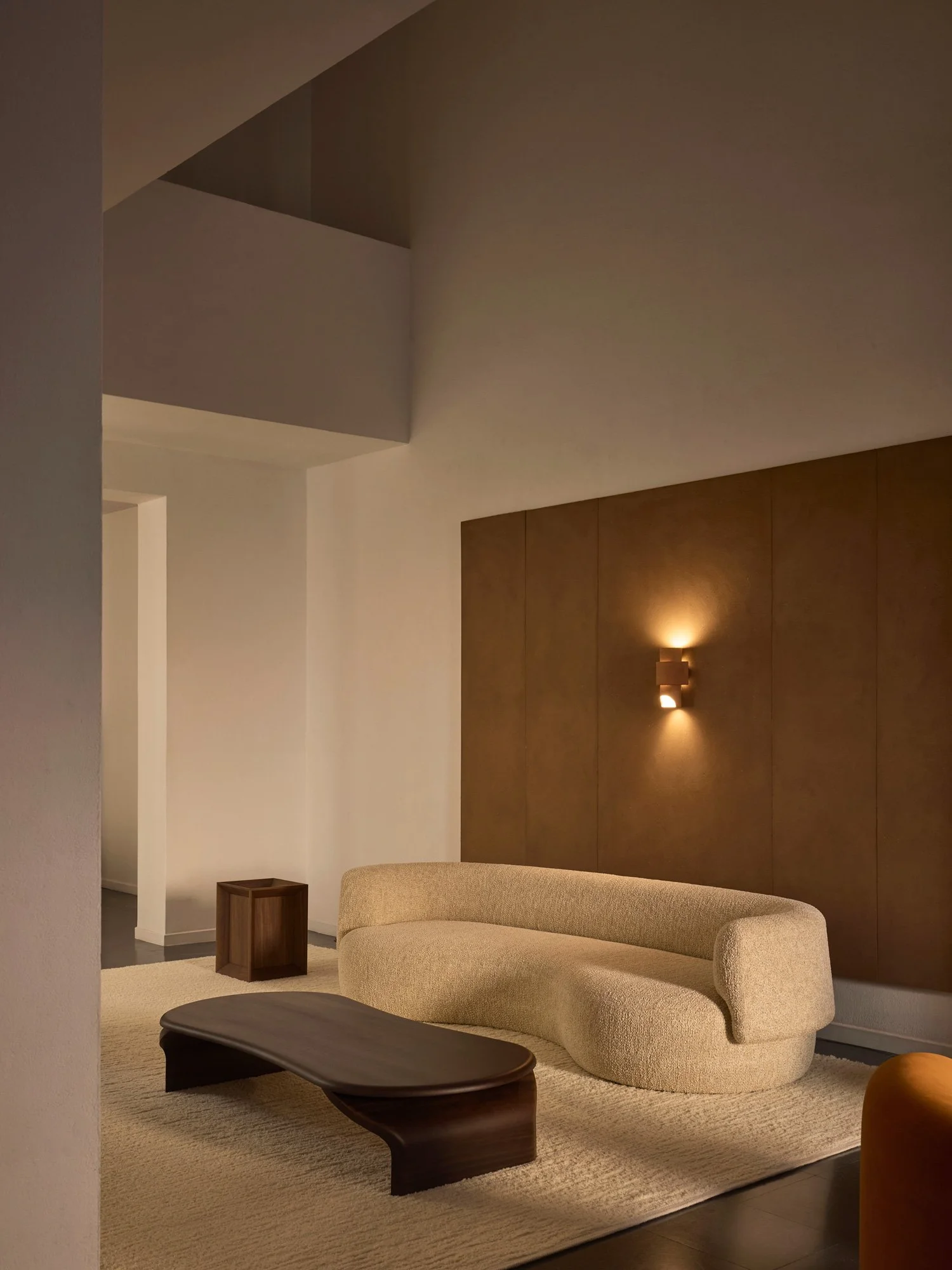 In the Boudoir, the LIL chaise and ottoman lounge back-to-back, asymmetrical yet attuned, while the ELSA side table punctuates the scene like a bronze haiku—light, elemental, and perpetually in motion. The Lounge introduces the MIK ceramic modules and the swirling MIU low table, whose sculpted mahogany form seems less crafted than conjured. Beside them, the FAO sofa and NED armchairs are dressed in earthy spring tones.