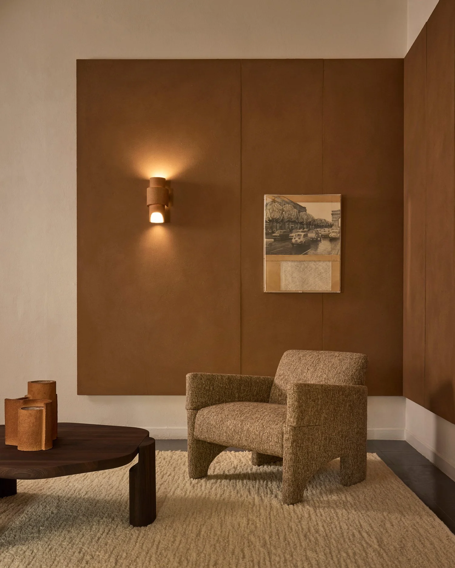 Each space within VELOURIA is a vignette, a chapter in an unfolding narrative of tactility. In the Vestibule, TIO armchairs recall the angled grace of transatlantic deck chairs, their sculptural lines softened by the plushness of Delcourt Textiles' LINN fabric. Nearby, the grogged clay of the ELP wall lamps emanates a quiet heat, echoing the toasty hues of their kiln-fired surface. The brushed smoked-oak LOB table grounds the composition with its subtle, smoky gravitas.
