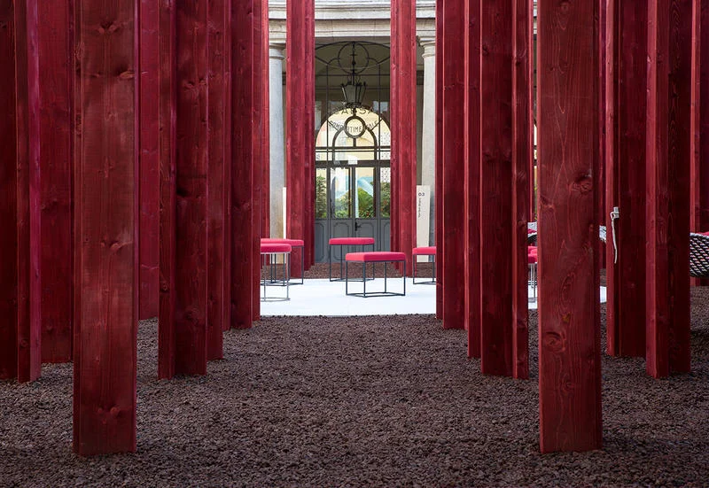 As this was my first experience in this Milan taken over by design, I decided to explore the central neighbourhoods without much previous planning. I wanted to be surprised by the city and I found myself captivated by the vibrancy of the many installations, showrooms and pop up stores that I encountered along the journey. One of those was the wooden oasis that Asif Khan designed for the Baroque Palazzo Litta, covering the courtyard with wood red columns and providing a placid and harmonious stop for the public. Similarly, Panasonic Design developed an ethereal installation for the courtyard of Palazzo di Brera, which explored an atmosphere created through drops of water.