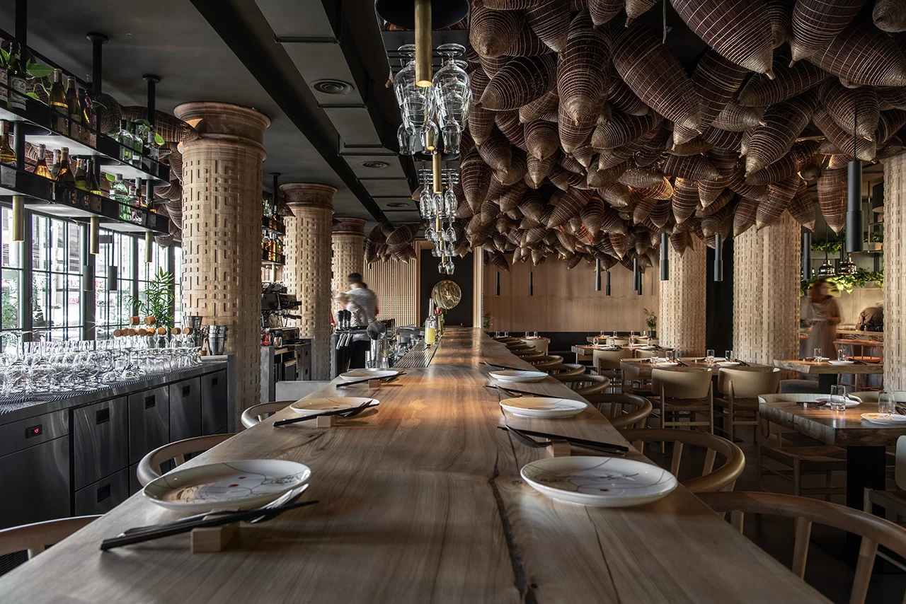 The most visually impactful element in the restaurant is perhaps the 600+ decorative bamboo fishing cages, specially brought in from Vietnam and canvassed across the restaurant ceiling. These cocoon shaped fishing traps are hand-weaves and are still abundantly used in Vietnam today. The unique shape is formed to adapt to the condition and behaviour of the local fish, therefore exclusive to Vietnamese culture. Utilizing the bamboo net’s quality to let light through, YOD Design Lab was able to create unconventional light filters for the artificial indoor lights.