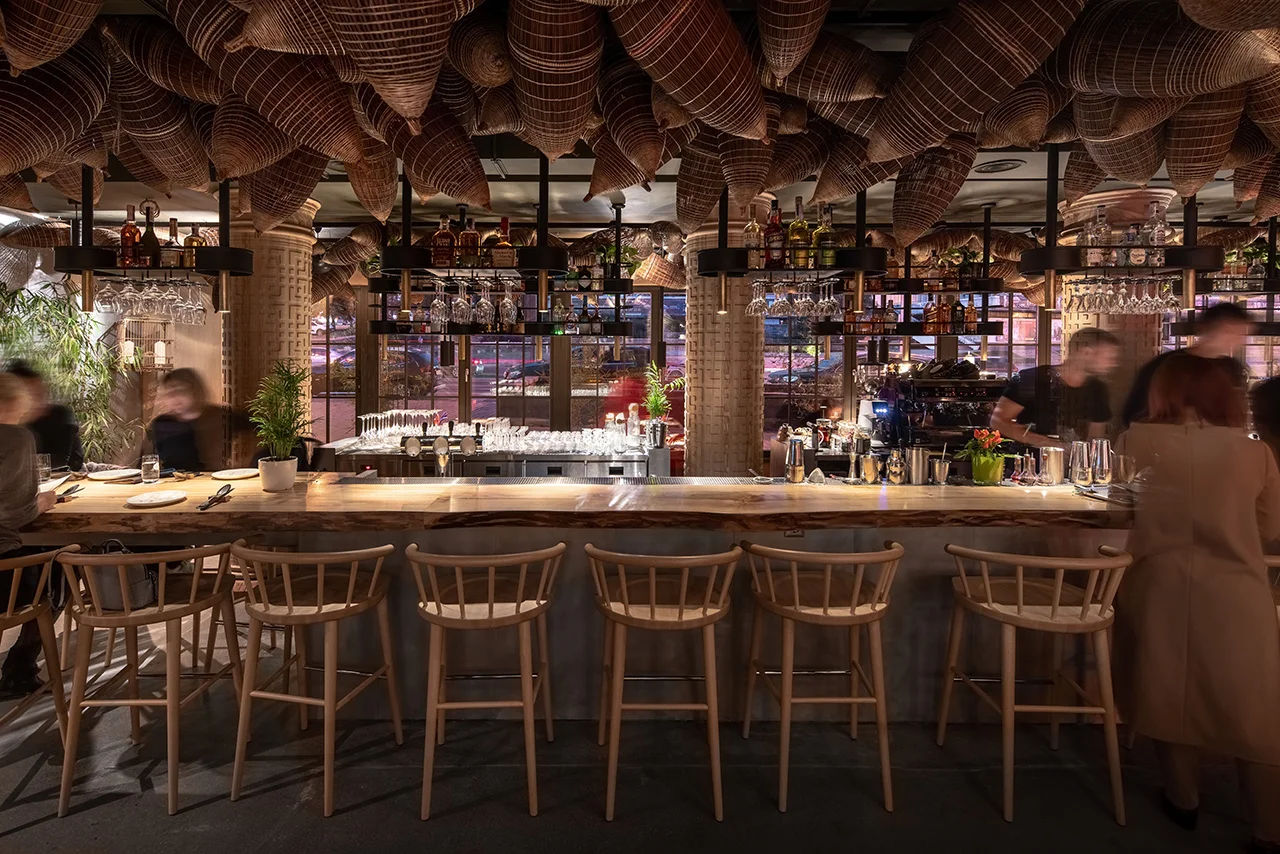 To encourage communication and transparency between the staff and restaurant visitors, YOD Design Lab decided on a open concept approach for the kitchen led by renowned chef Yuri Priemsky. This allows visitors to observe the preparation of the dishes and freely engage with the cooks when sitting at the bar that separates the kitchen from the hall. Simple solid wood tables and oriental style chairs complements the busy ceiling without competing against it.