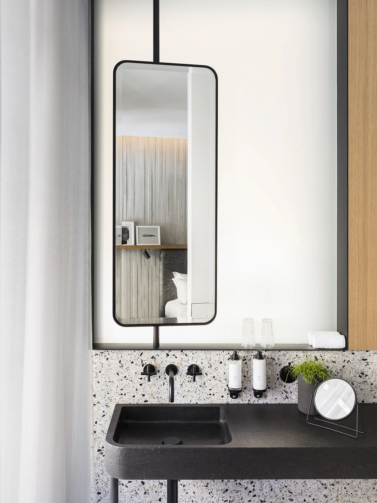 The bathrooms have been completely covered in terrazzo (mainly white or anthracite grey) and feature a black granite washbasin on a steel stand as well as taps with a matte black finish.