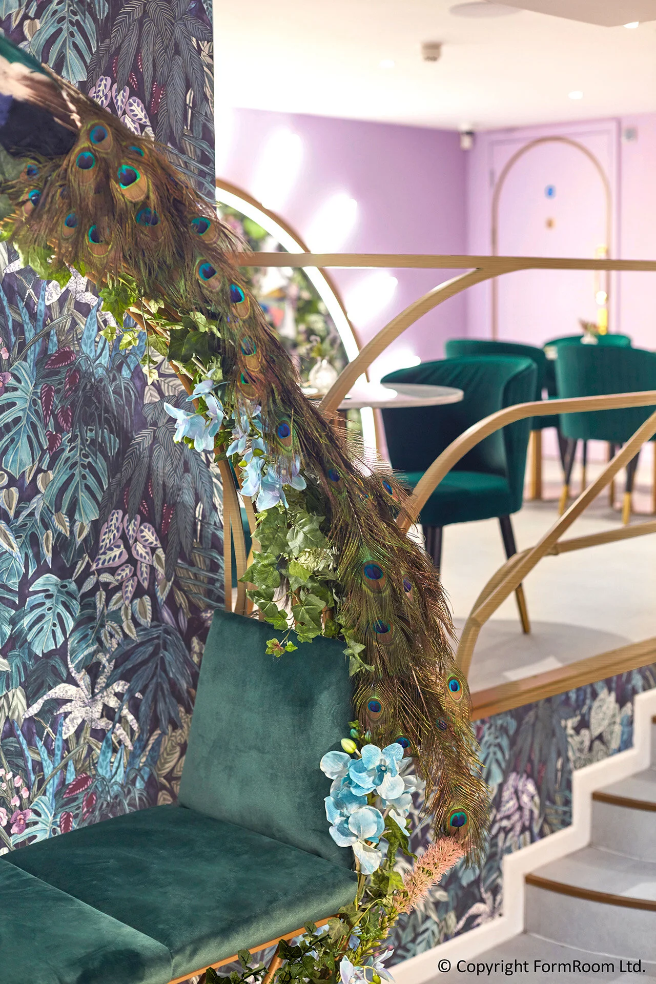 To create an atmosphere that evokes the brand’s ethos, a series of highly visual and immersive installations are incorporated throughout the interior, all centered around the narrative of moving through an enchanting forest-scape; peacocks, trailing greens, and vibrant florals emulate the imaginary fauna and floras of a mystical land. As you continue your exploration, you can even find abstract references to water that is presented throughout the space. Lily pad sections house bespoke chairs with velvet upholstery positioned alongside an inlaid resin river. The soft, ethereal glow of the amethyst jewel-toned river emulates the glistening movement of water. The flowing river evokes a sense of mystery, beckoning guests to follow along its course to explore deeper into the space.
