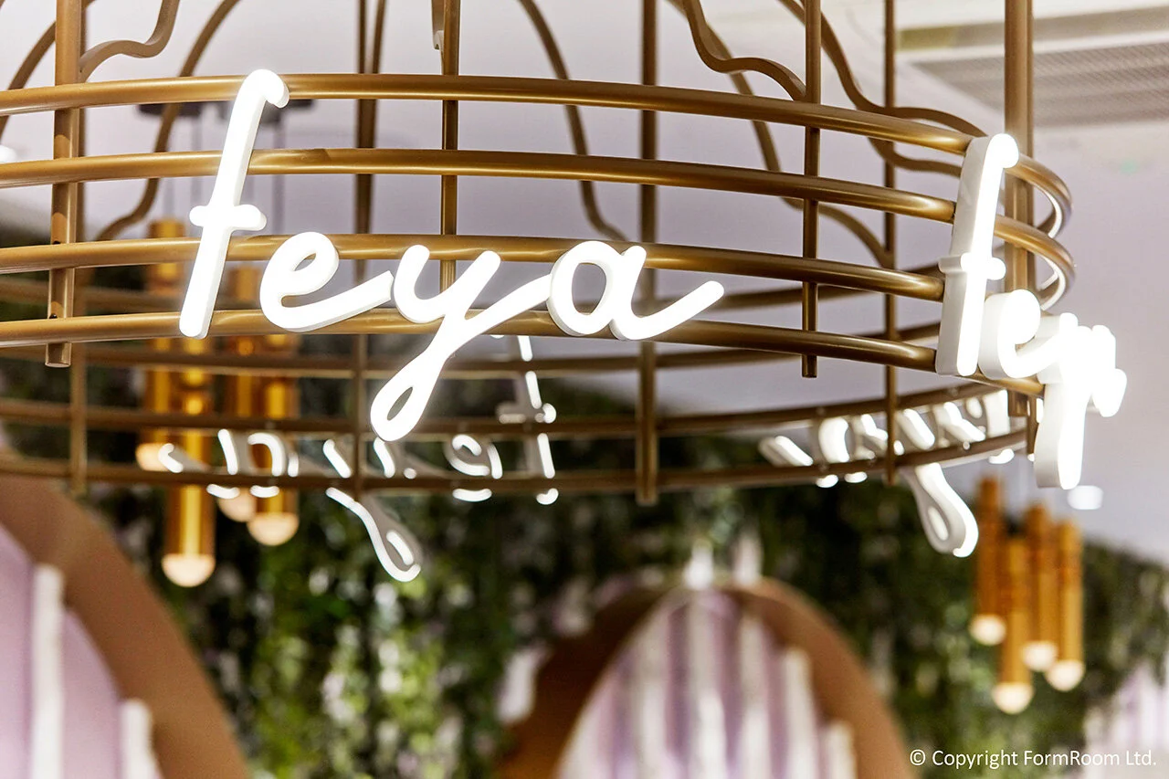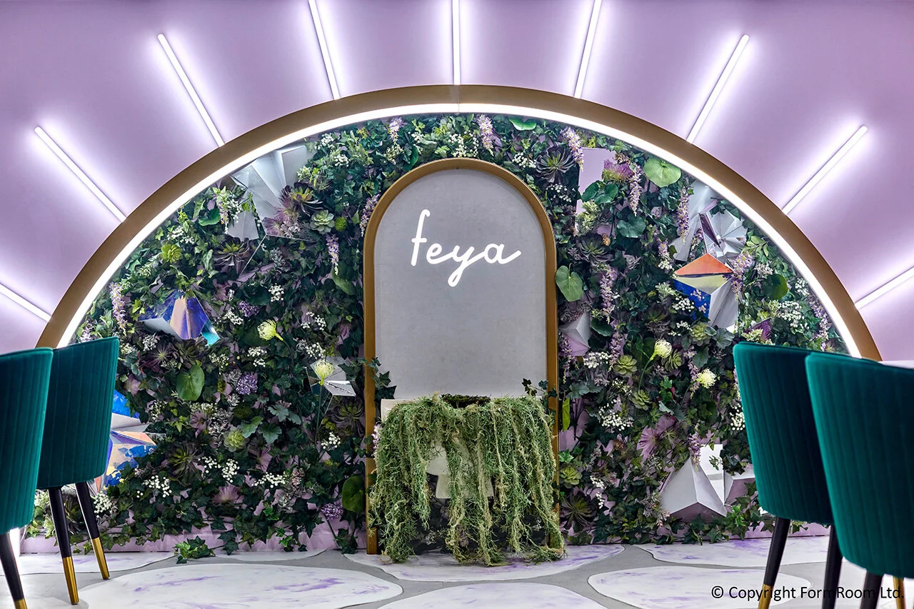 Upon entry, guests are welcomed into a fantastical world filled with illusions. From the lush, decorative greeneries to the accenting tree trunks reminiscent of an enchanting forest walk, every design element echos Feya’s brand ethos of “It all starts with a dream”. As a way to evolve the existing Feya brand identity, the design team at FormRoom combined a rich, textural palette and pastel hues with bold, bespoke features to invite guests to share their experience and discoveries through social media.