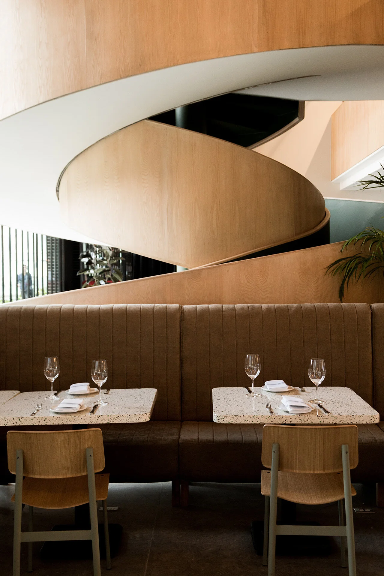 The large dining hall is located on the third floor of the bustling Artz Pedregal mall. Upon arrival, visitors are greeted by glossy black brick-clad façade and large sliding glass doors. A whimsical, ribbon-like ramp-staircase leading up to a children’s play zone and a private meeting and dining space on the 2nd floor invites curious passersby to walk up and explore. Towards the back of the dining hall, a large terrace offers tremendous views of the area’s lush vegetation through sets of panoramic windows.