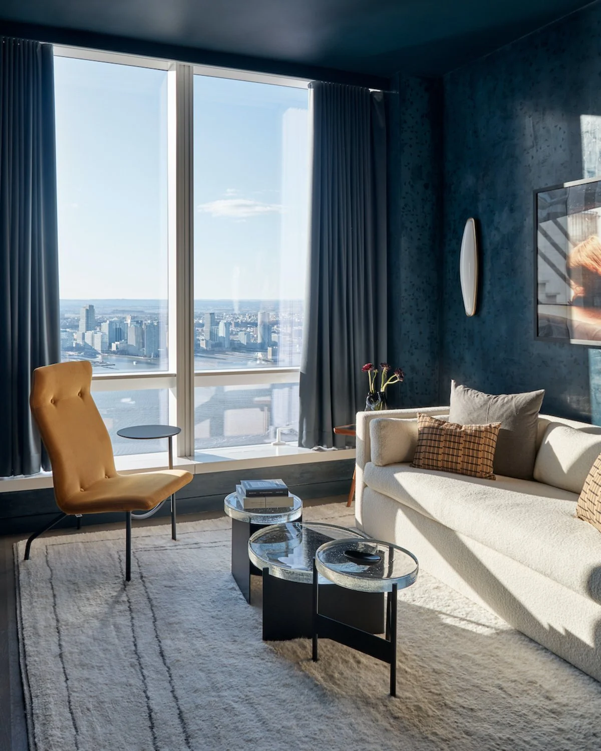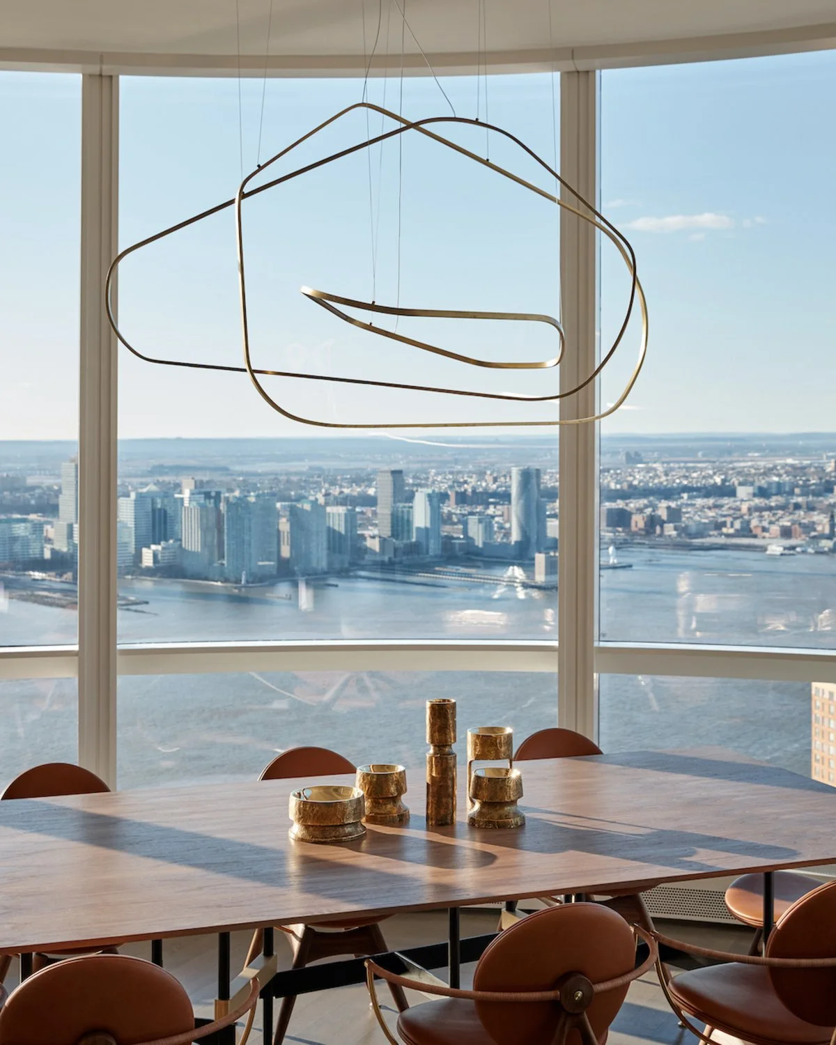 The apartment is filled with many pieces of notable artwork. Yet, it all comes together to form a tasteful and elevated living environment without taking away from the stunning water view framed by the floor-to-ceiling windows.