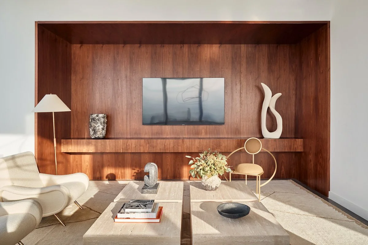 Contemporary artwork referencing iconic designers such as Gio Ponti, Marco Zanuso, Ico Parisi, Jean Prouvé, and Pierre Chareau hangs unassumingly on the walls, complemented by bespoke pieces designed by the interior designer to present a tranquil and enlightened living experience.