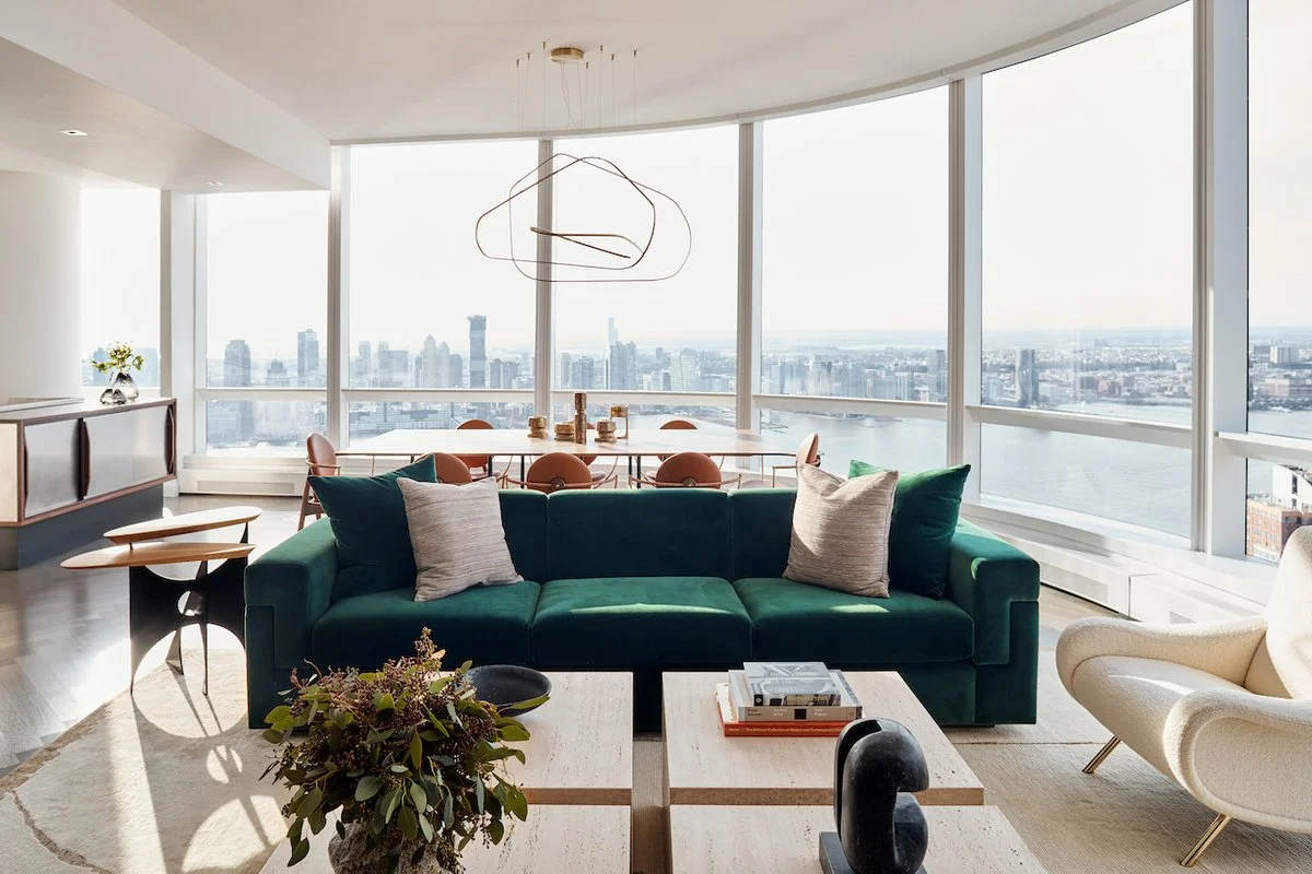 The living room niche has walnut panelling and a seating area with an emerald green sofa with an Alexander Calder-inspired end table, “Lady” chairs by Marco Zanuso, and a travertine coffee table ensemble of Jessica's design. Contemporary ceramics by Berlin-based artist Jojo Corväiá accent the coffee tables and the niche. The artwork, “This is Magic” by Jeppe Hein, reflects the expansive view of the city and beyond.