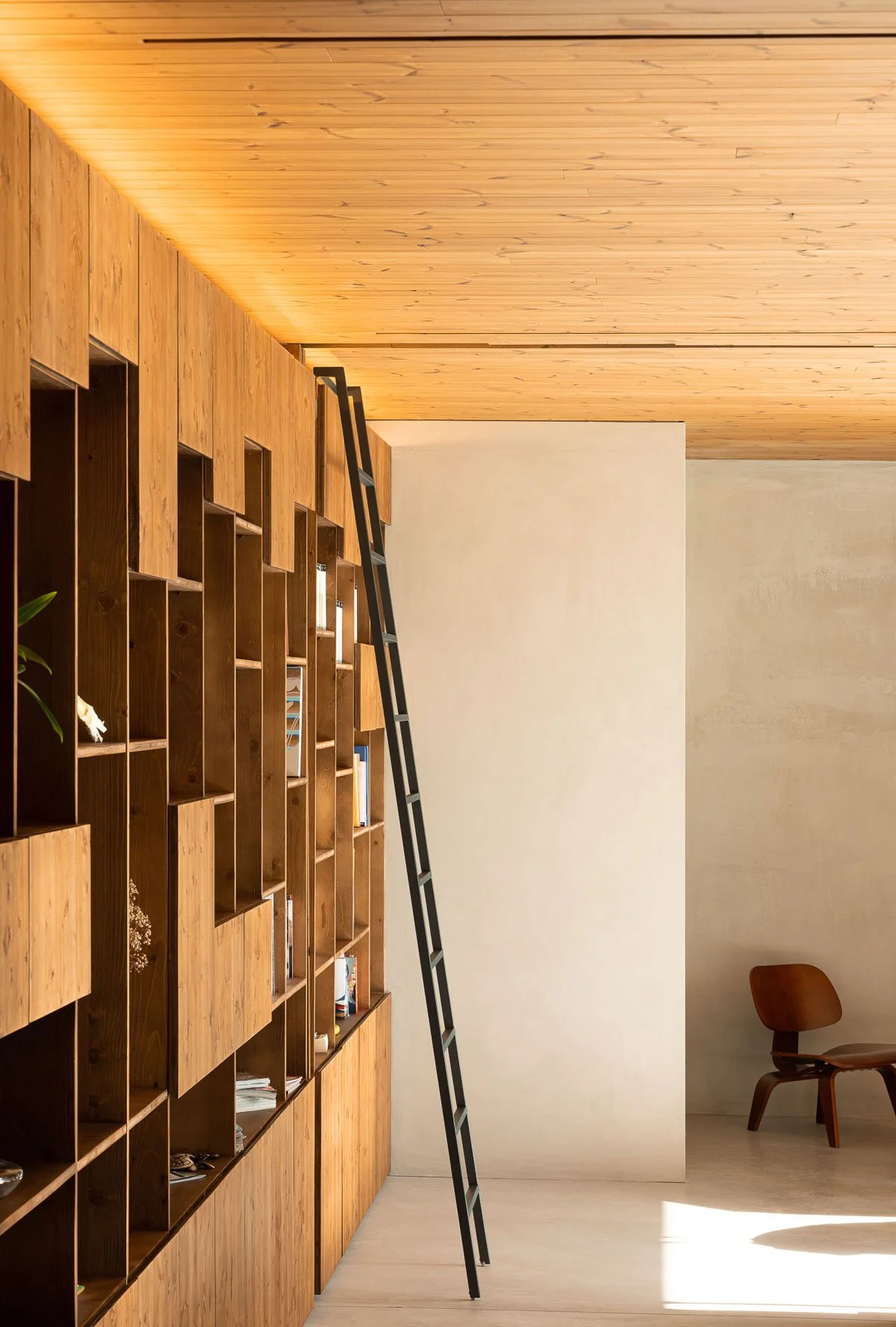 People’s fluidity through spaces, both horizontally and vertically, is connected by virtue of this core space, where the ceiling wood turns and becomes the floor finish of the level above. This game between continuity and transition allows the natural light to disperse into the horizontal planes, both floor and ceiling, converging into a gradient between social and leisure spaces and rest spaces.