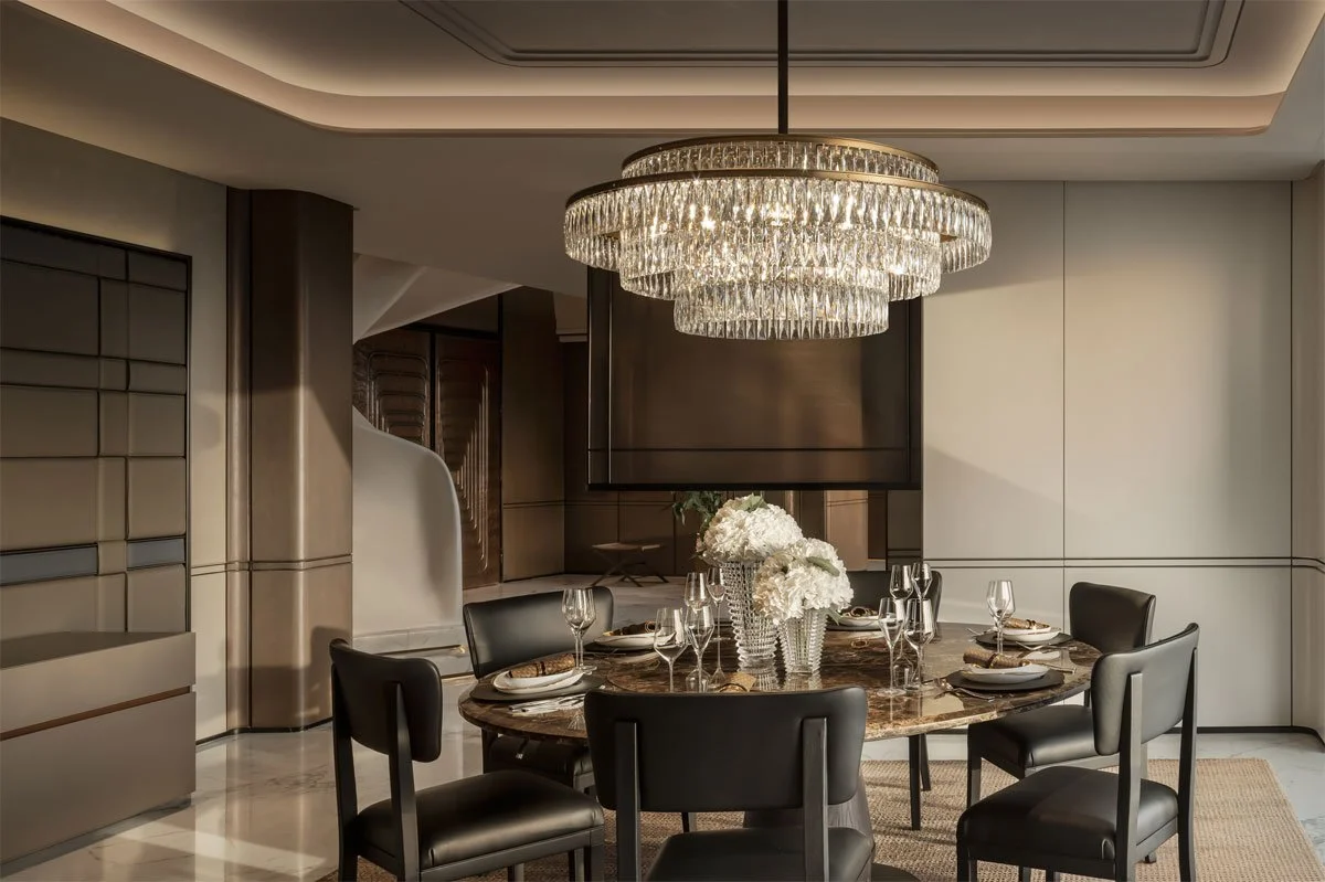 The dining area pairs a round marble table with sophisticated black leather chairs and a statement chandelier.