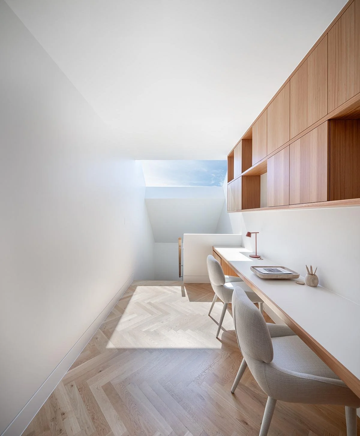 Herringbone oak flooring extends across the entire extension, adding a tactile warmth to the minimalist palette. This durable choice is intentionally selected to withstand the lively activities of children, ensuring that the home's elegance is as enduring as it is enchanting.