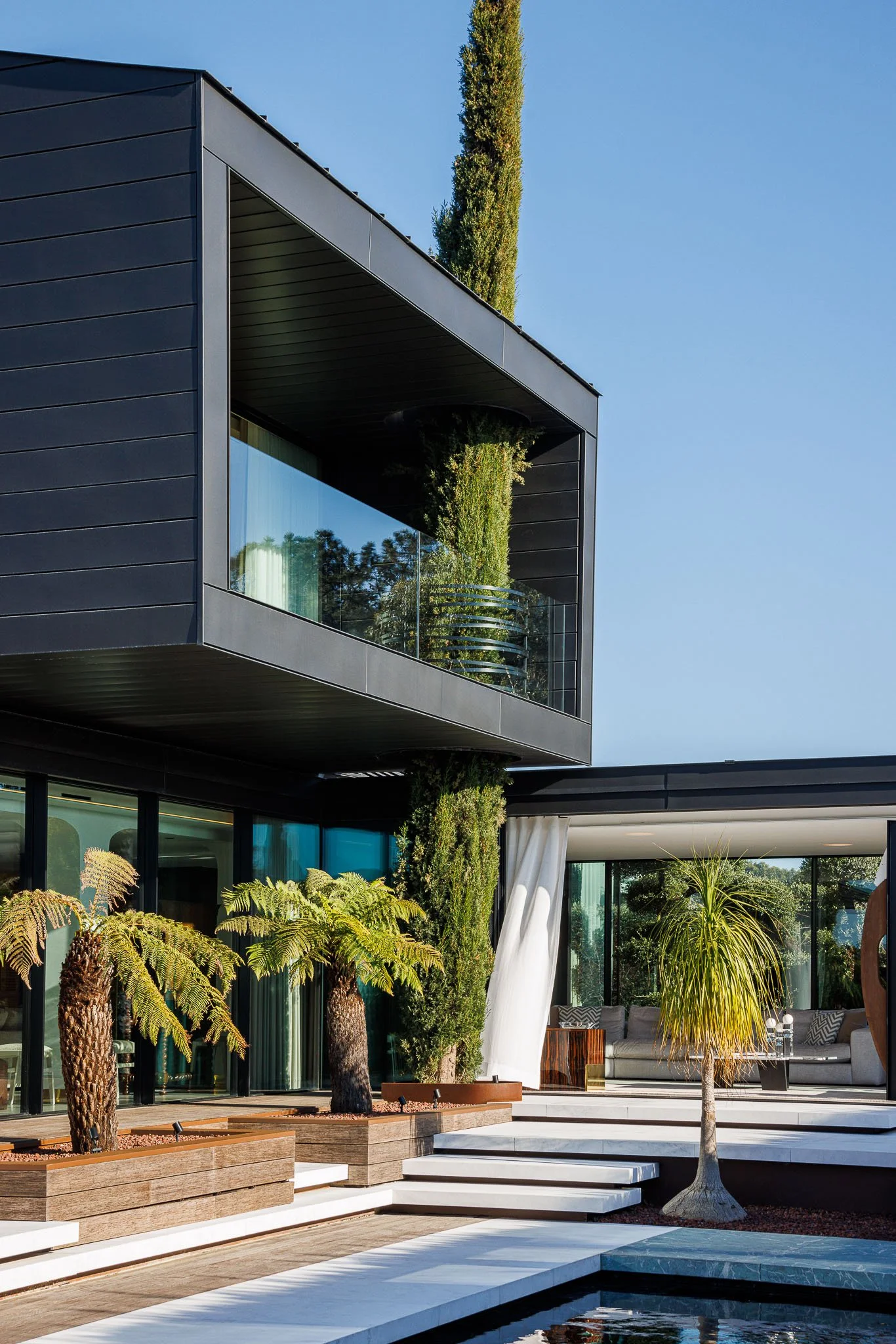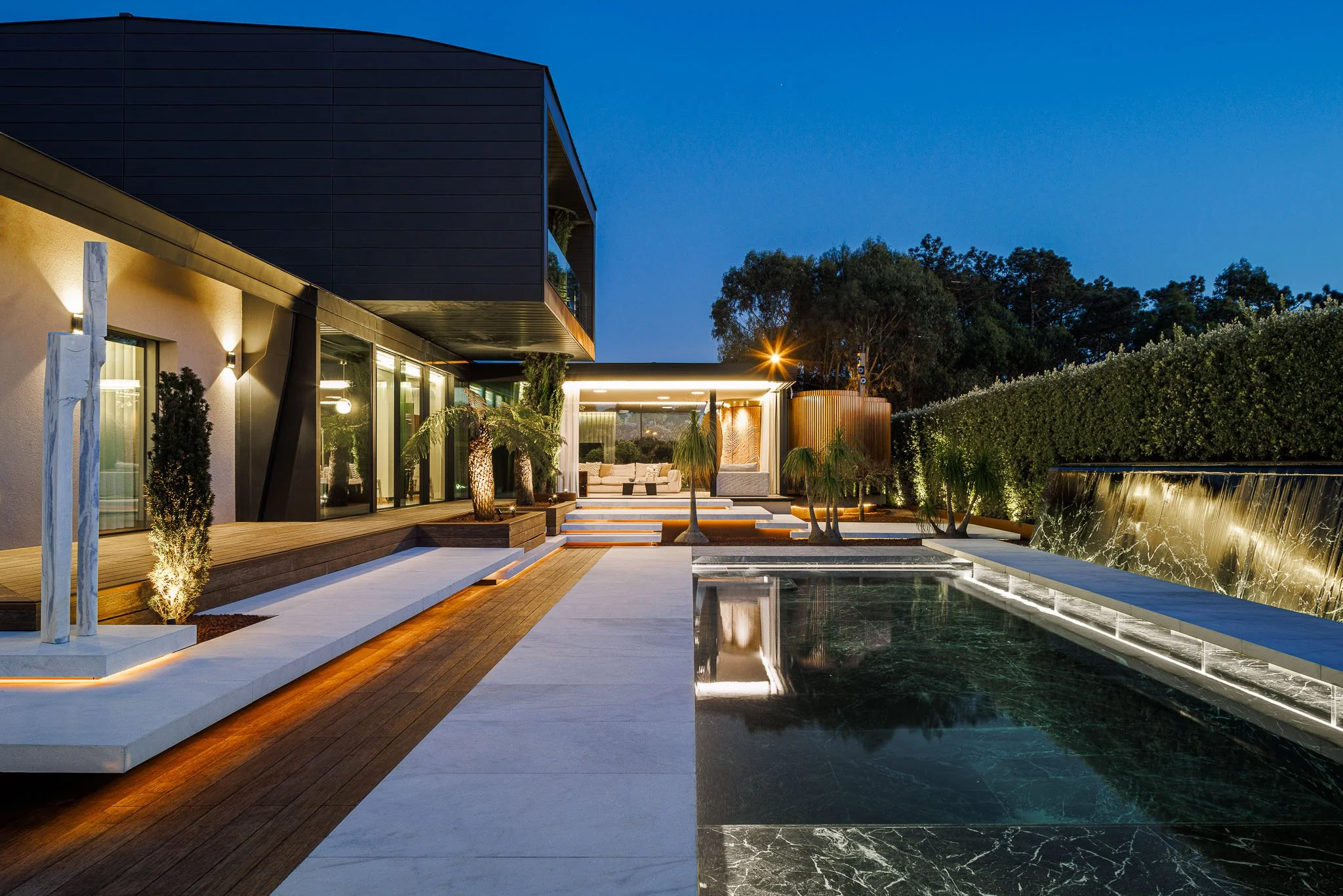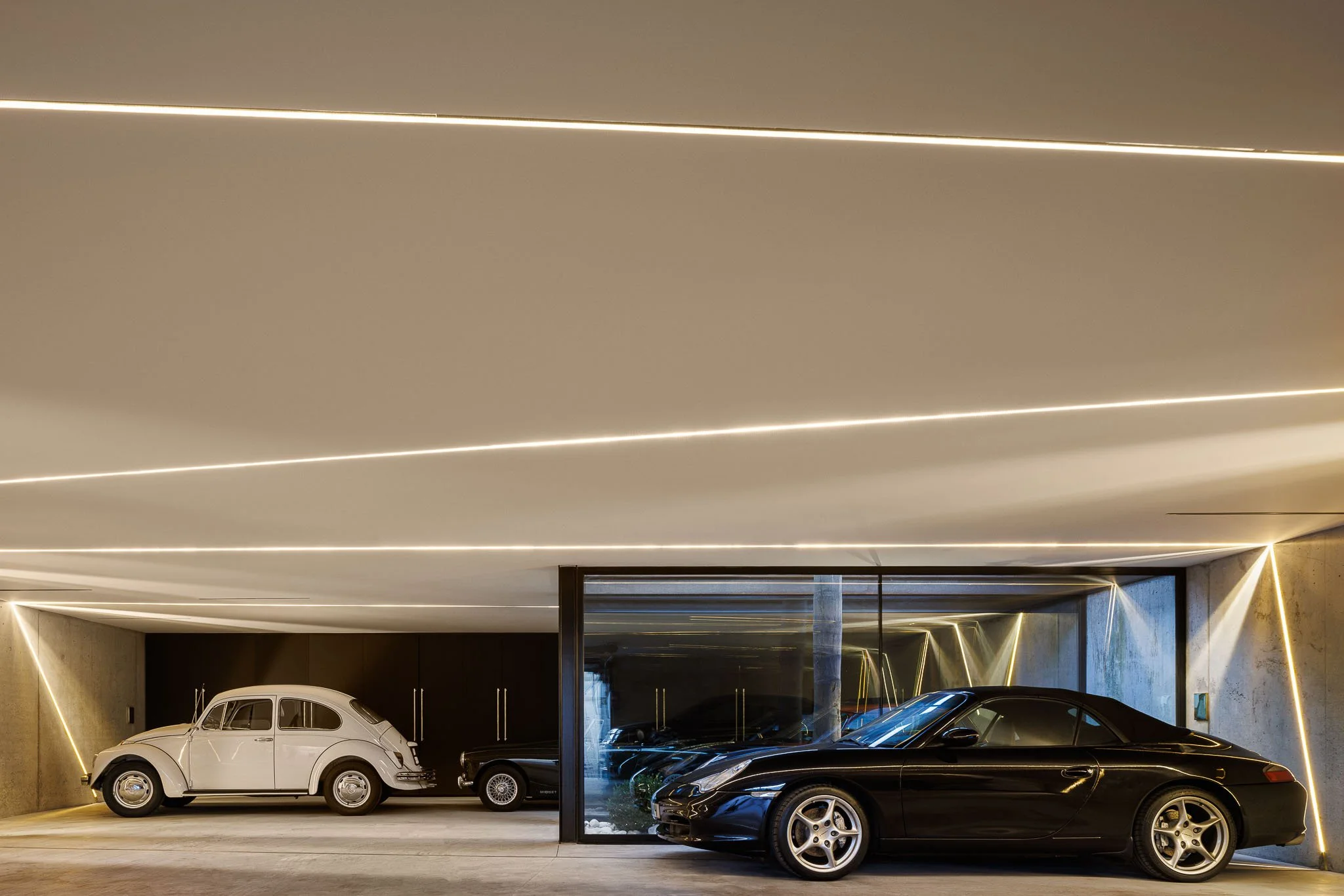 As the sun sets, the captivating lighting design takes center stage. The home's outdoor lighting is a spectacle in itself, with geometric installations that illuminate the steps and extend into the car garage, which serves as a private showcase for the owner’s car collection.