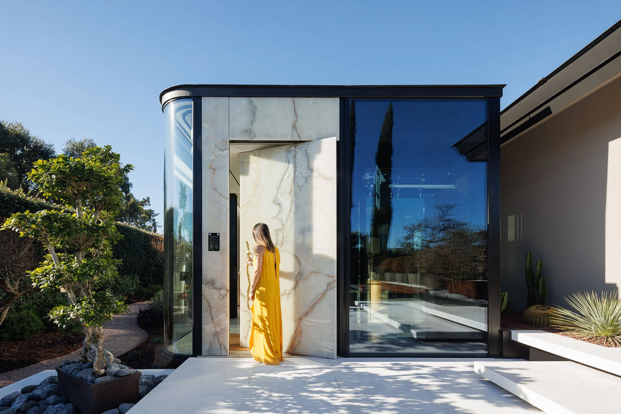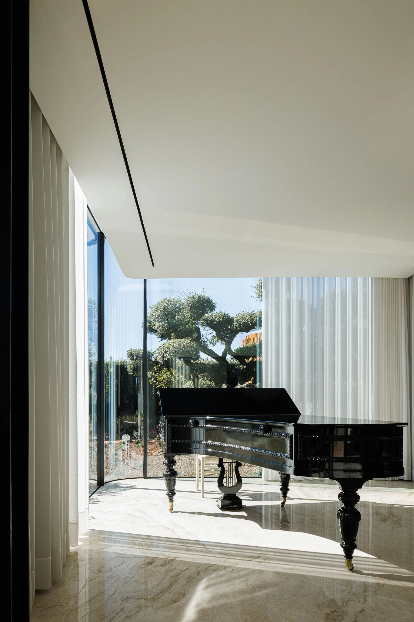 A dramatic entrance awaits visitors – a broad, cantilevered marble door set against a glass enclosure, offering sweeping views of the immaculately landscaped gardens. A notable detail is the elongated gold handle on the entrance, which resembles a branch, yet another thoughtful nature connection implemented by the design team. Inside, a grand piano sits by a floor-to-ceiling glass expanse, creating a serene, light-filled space for music and relaxation.