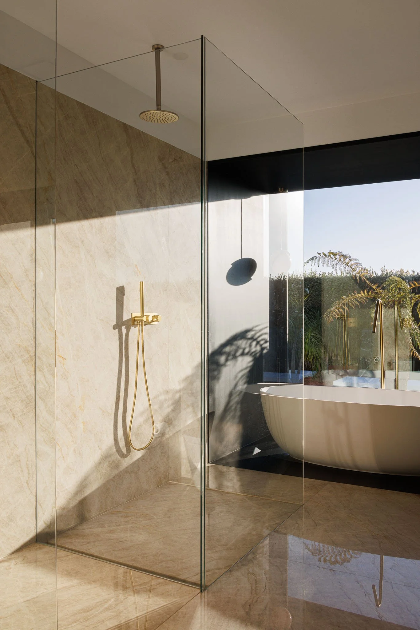Residents enjoy a relaxing view of the outdoors even in the shower and bath.