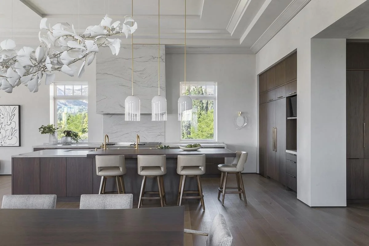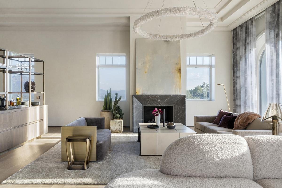 As one enters the residence, the main attraction immediately draws the eye. Three arched doors line up at the end of the salon, framing awe-inspiring views of Salt Lake City and majestic mountainscapes. However, this breathtaking feature also posed a significant challenge. The raw space boasted ceilings that reached a staggering 20 feet, with dormers cut into the highest points.