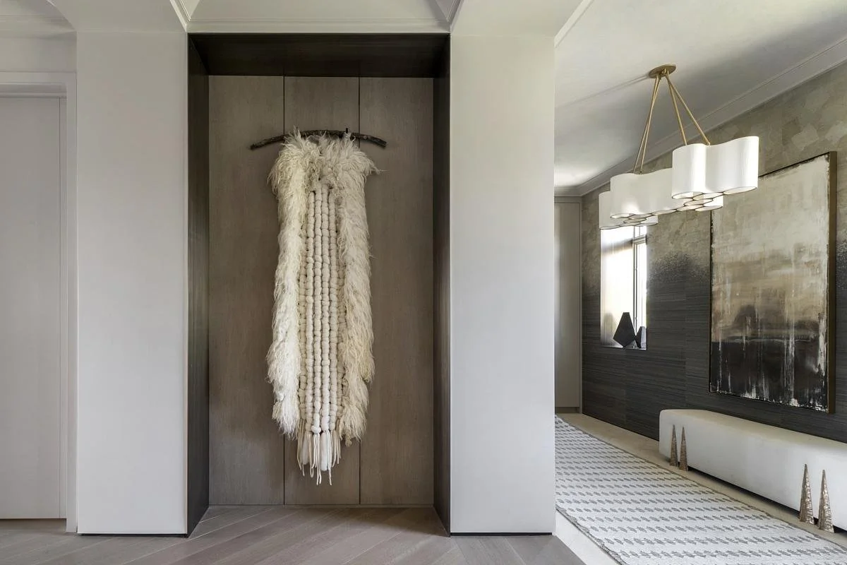 In the kitchen, the vision embraced the integrity of a La Cornue range, infusing a sense of scullery that truly reflects the inhabitants' lifestyle. Just off the elevator, a Ralph Pucci chandelier greets visitors, setting the tone for the space. The walls are adorned with Phillip Jeffries wall coverings, featuring pewter and gold accents, horsehair, and grass cloth, adding texture and depth.