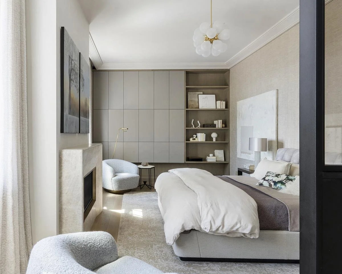 The primary bedroom reflects the essence of old Parisian apartments found in the design district. Moldings, plaster finishes, 12-foot-tall draperies, bespoke cabinetry, and Holly Hunt furnishings create a romantic and modern space that embraces a gentle way of living in a warm and inviting environment.