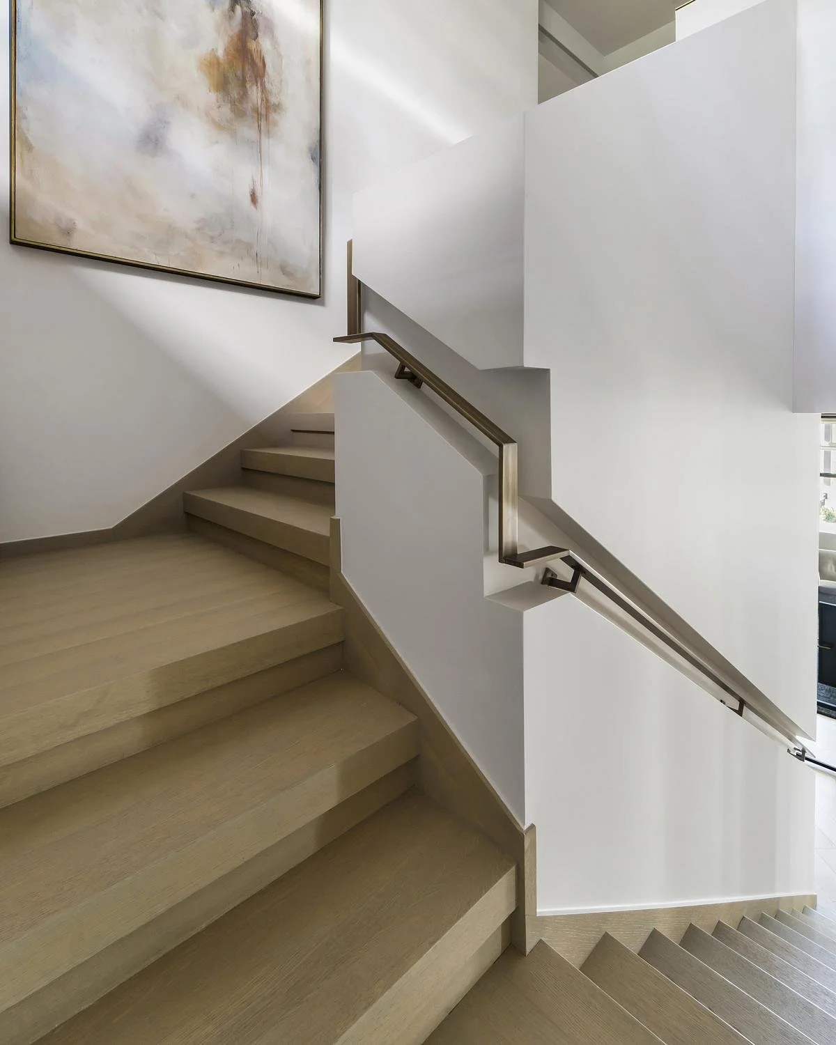 A glimpse around the corner reveals the staircase, a marvel that had to be created from scratch in this entirely open space. Inspired by a visit to Christian Liaigre's apartment in Paris, the design team crafted an immersed handrail, utilizing the space within the wall to create a cavity filled with elegant brass details, as visually pleasing as it is comfortable to the touch.
