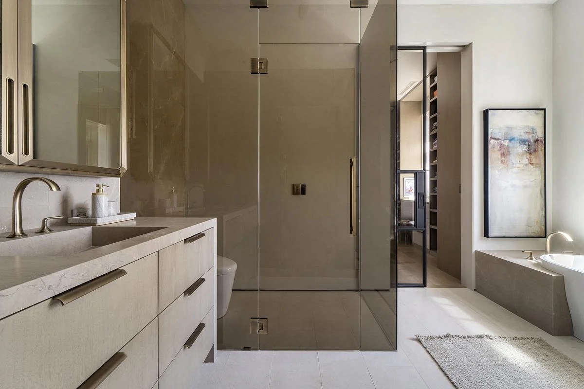 Luxurious finishes define the bathroom, creating a spa-like atmosphere that seamlessly blends beauty with practicality. Multiple shower heads, body sprays, and an overhead rainfall shower head are complemented by beautiful stoned niches. Integrated stone sinks maintain a seamless flow from countertop to sink, while the faucets themselves serve as sculpted architectural features that feel soft to the touch. The private toilet room, enclosed in glass, provides the ultimate sanctuary.