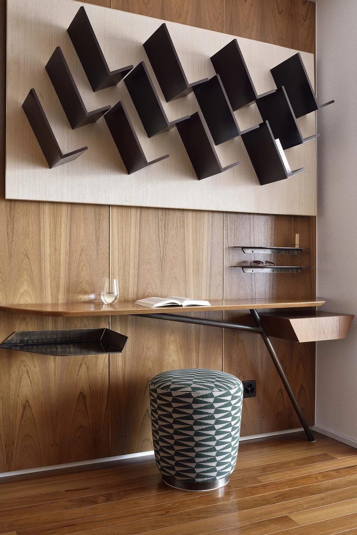The bathrooms are one of a kind, with a perfect mix between the lightness of the glass mosaic and the richness of the wenge wood. The guest bedroom features dynamic and asymmetric shapes. Materials used are teak hardwood and fabric with geometric pattern.