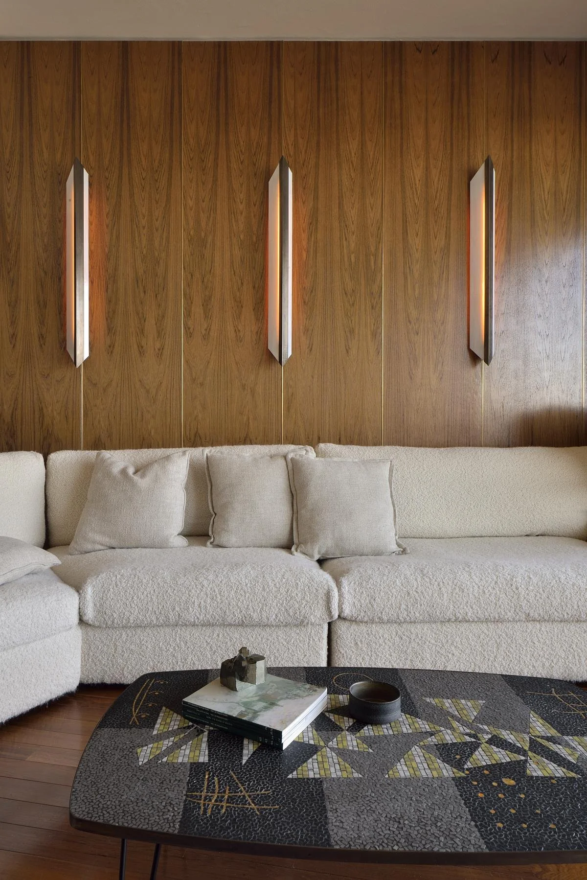 The living room features a large sofa, designed by Labscape, that becomes an oasis of space for cultivating thought, reading, and conversation. The sharp lines of the slender wooden structure leave plenty of room for the snug comfort of the seat cushions. The large wall lamp, also designed by Labscape, is a sculpture-object composed of opaque blown glass and a V-shaped brass profile. Its elongated and asymmetrical shape allows for a surprising and architectural projection of the “mural” light.