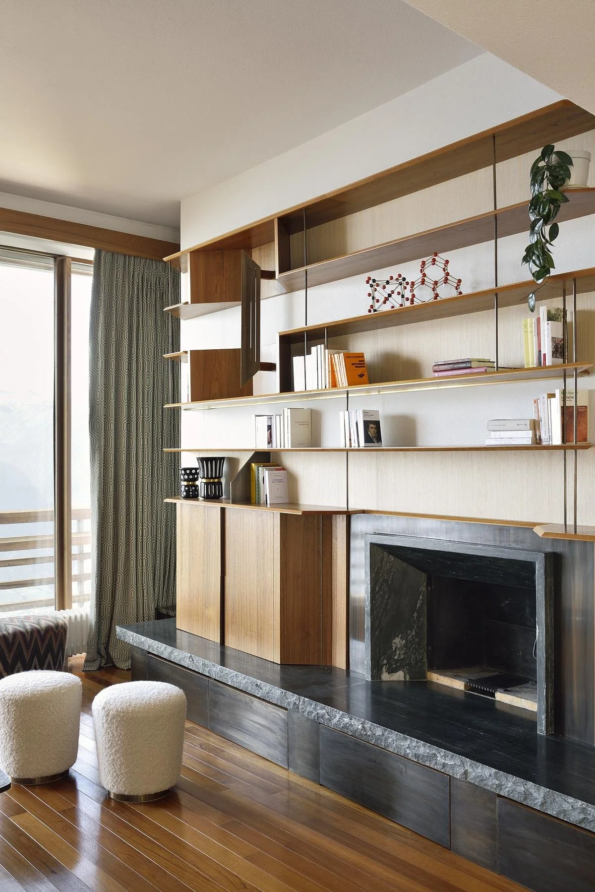 The apartment combines the charm of a mountain chalet with the elegance typical of modernism. The bookcase provides for a strong ensemble that integrates a surprising hidden bar, a fireplace, and a folded light in bronzed brass framed in a wooden niche. The bookcase was conceptualized as an architectural facade of a building with its overhangs and recesses. The designers mixed dynamic and asymmetric shapes, used solid teak wood, metal, and natural materials such as raffia.