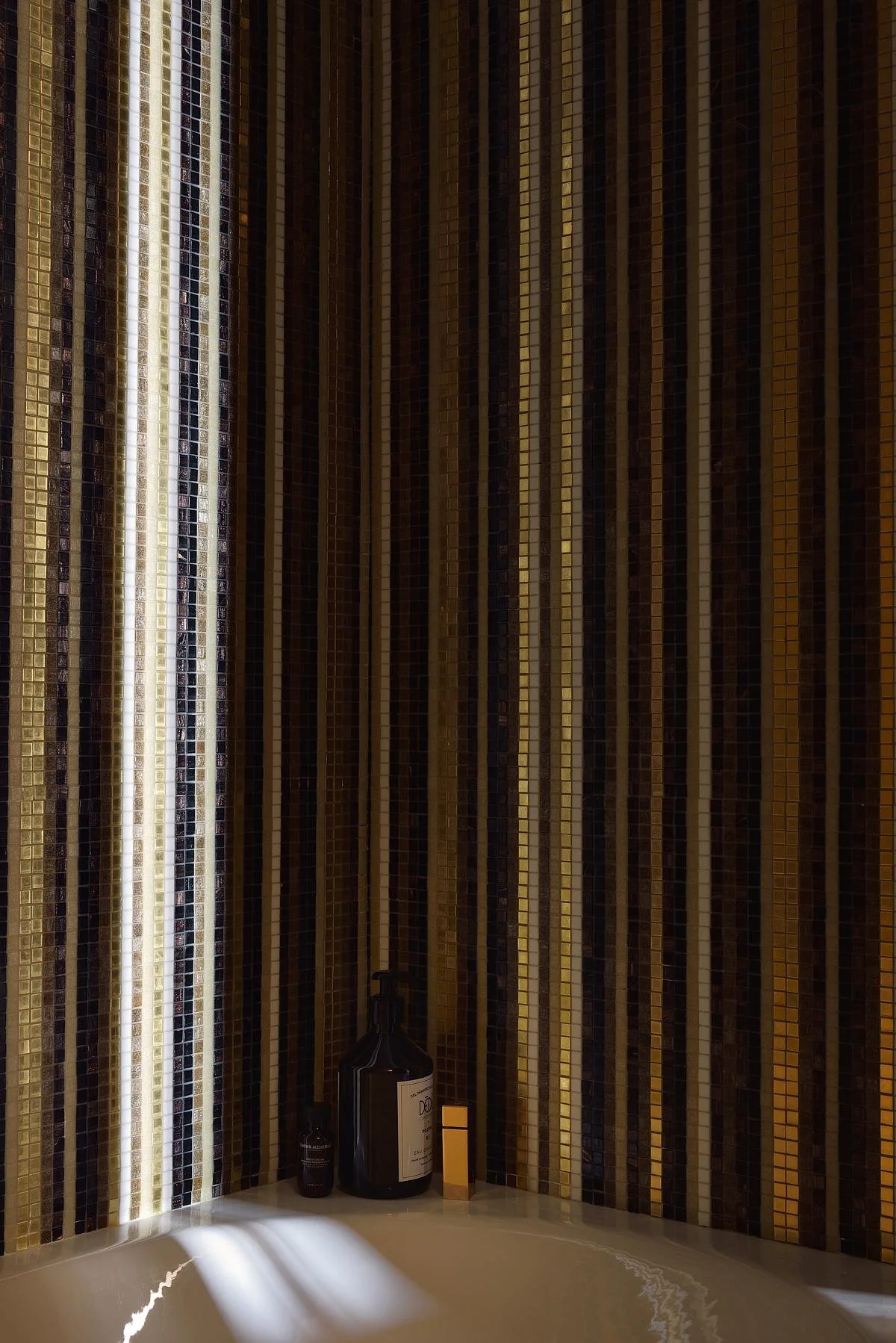 The swimming pool in the building shares a similar rhythmic, graphic vibe as the apartment interior.