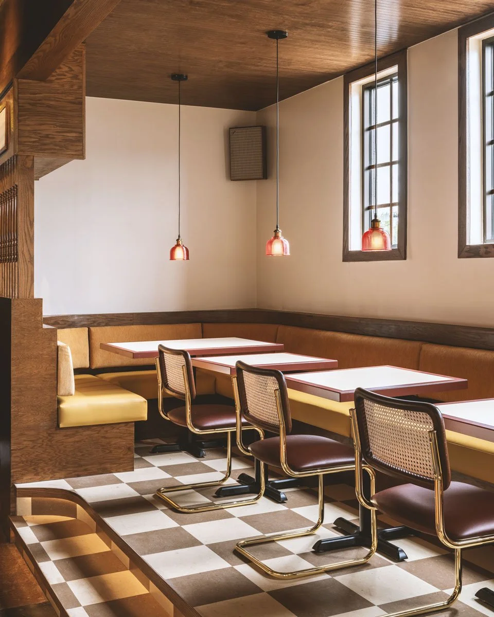 Slide into one of the retro booths to enjoy thin-crust Midwestern square slices of pizza under vintage Tiffany glass pendants from Pizza Hut. The raised dining area features a brown and cream checkered laminate floor, classic spindle partitions, and a yellow corduroy banquette. The fun extends to the outdoors, where the patio features a canopy and columns in a gradient of cheerful yellows punctuated by refurbished picnic tables with floral patterned umbrellas from Business & Pleasure.