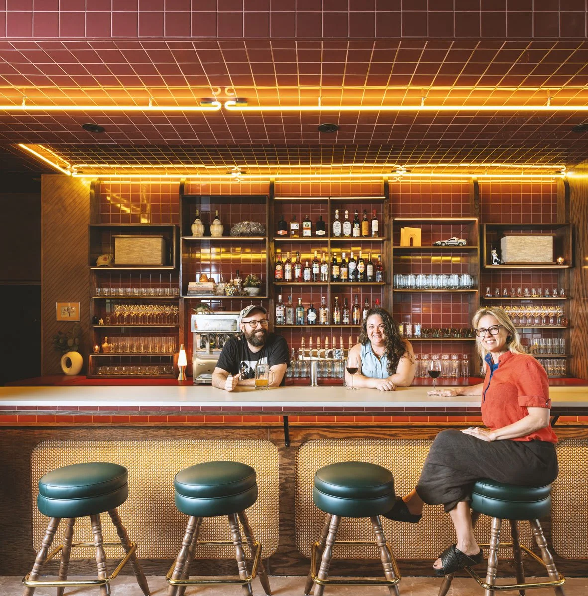 From left to right. Owners Martin and Sara Stayer with designer Gin Braverman sitting at the bar.