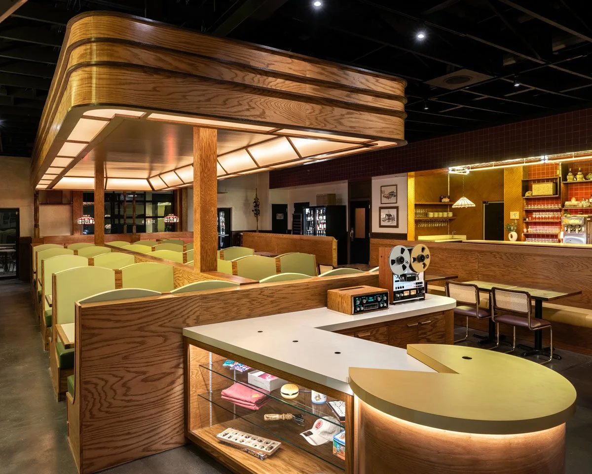 Similarly, designer Gin Braverman enjoyed the collaborative process with the owners, where they would amplify each other's creative ideas. Braverman shares one such example. "The host stand, which was originally going to be a Pac-Man shape, evolved into a glass prize case with the Pac-Man eating the dots along the countertop. The Stayers also envisioned a mini-arcade, for which we specified a mirrored ceiling tile. They came back with disco-ball style adhesive sheets, which nails the aesthetic perfectly."