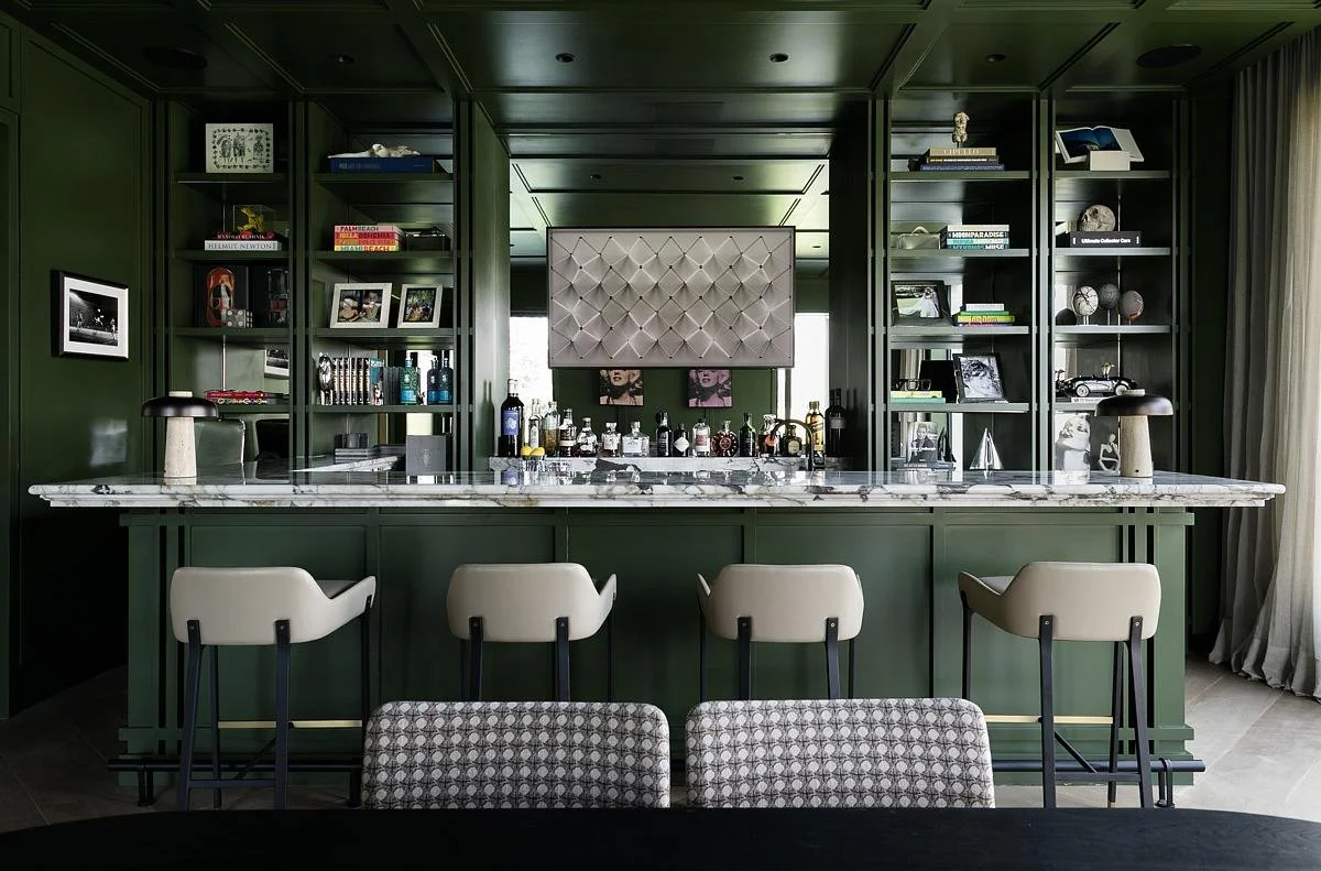 The retro dark green in the bar area establishes an impactful mood unique from the rest of the home.