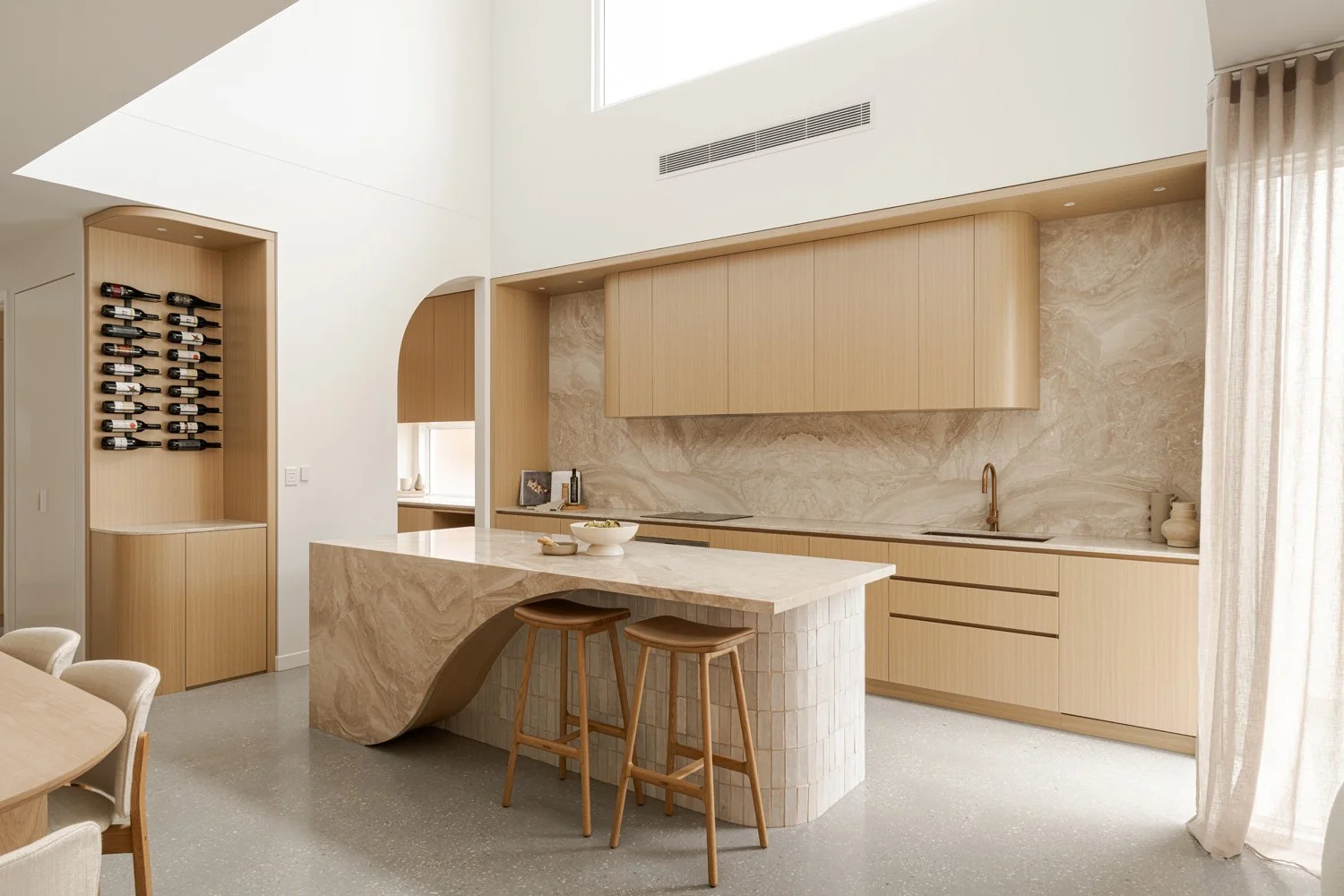 The kitchen and living area features a double-height ceiling with a skylight drawing in abundant natural light. The distinctive design of the kitchen island, with its curved marble detail paired with rectangular tiles of the same soothing colour palette, makes for a unique centrepiece. The rounded corners are a common design language witnessed throughout the living space, from the gently shaped kitchen cabinets to the arched entryway into the scullery. The wall housing the fireplace in the living room echoes this design language, and the first few steps of the stairs carry this flow upstairs to the private quarters.