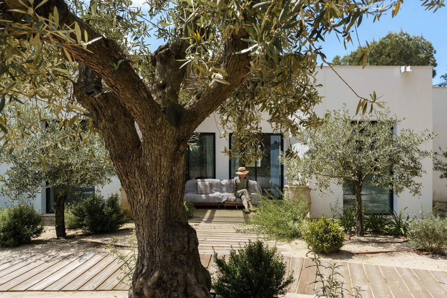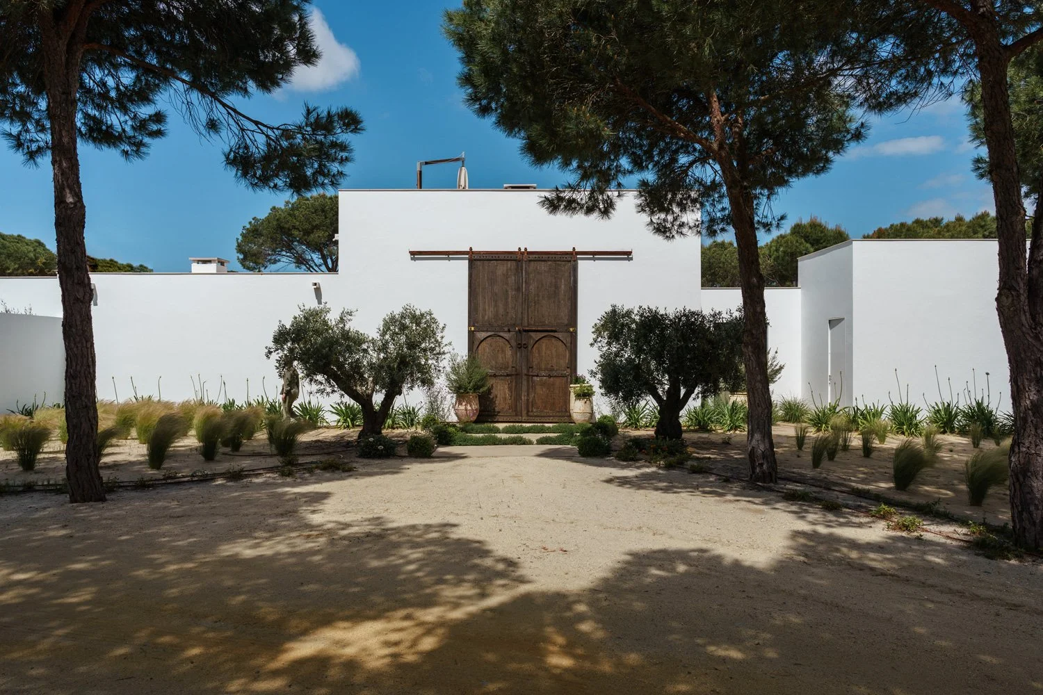 Whitewashed geometric volumes contrast beautifully with the textured landscape of cork oaks and gravel paths.