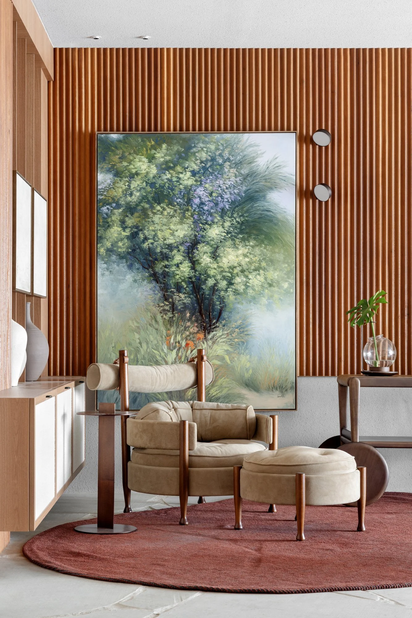 Designed by Flávia Koloske and Tainá Pravato for CASACOR Florianópolis 2025, this 82-square-metre environment captures a moment suspended between motion and stillness. It feels at once grounded in natural materials and lifted by light, texture, and air.