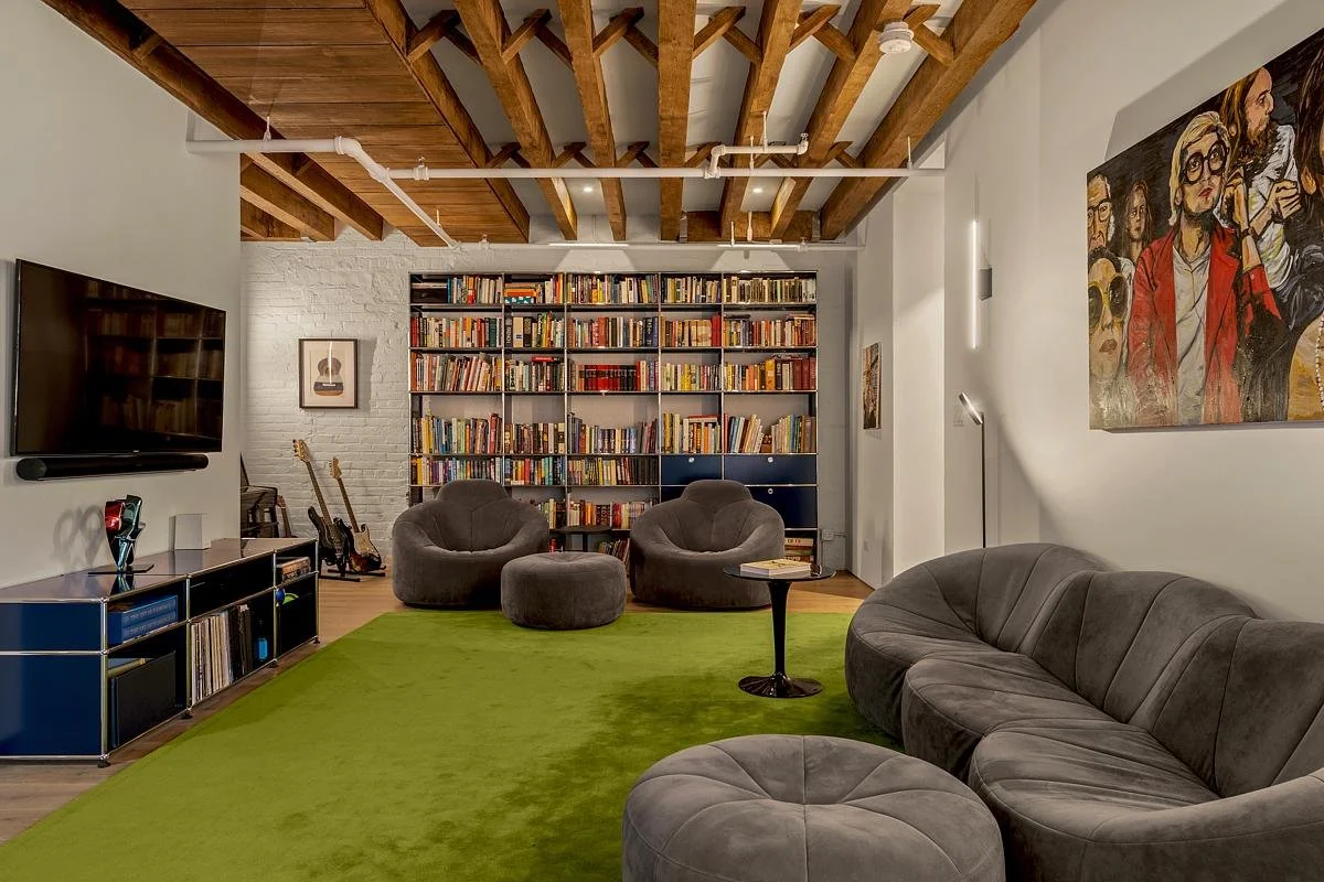 The lounge’s built-in bookshelves, plush seating, and moss-green rug create a cozy retreat infused with artistic personality.