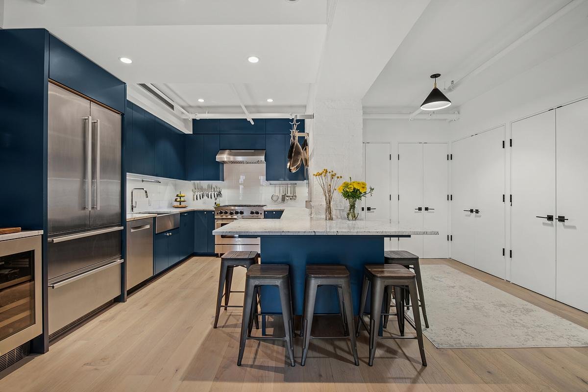 The open-plan living area forms the heart of the home, where conversation, creativity, and comfort flow seamlessly together. A long oak dining table anchors the space, while vibrant blue cabinetry in the adjoining kitchen adds a sophisticated punch of colour. Marble countertops and stainless-steel appliances bridge industrial utility with modern elegance, creating a workspace that feels equally refined and functional.