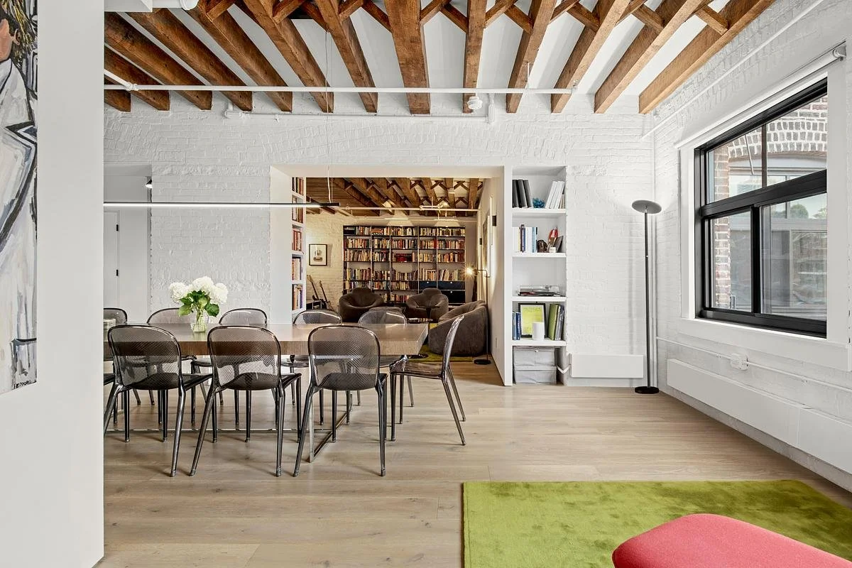 Inside, the architect approached the renovation with restraint and respect, preserving the essence of the original structure while redefining its rhythm for modern life. The 1,900-square-foot residence unfolds as a sequence of luminous, tactile spaces where old and new coexist in deliberate harmony. Thick brick walls, painted crisp white, echo the building’s origins while amplifying natural light that filters through the black-framed windows. Overhead, the exposed wooden beams soften the geometry of the ceiling, introducing a sense of warmth that counterbalances the loft’s urban setting.