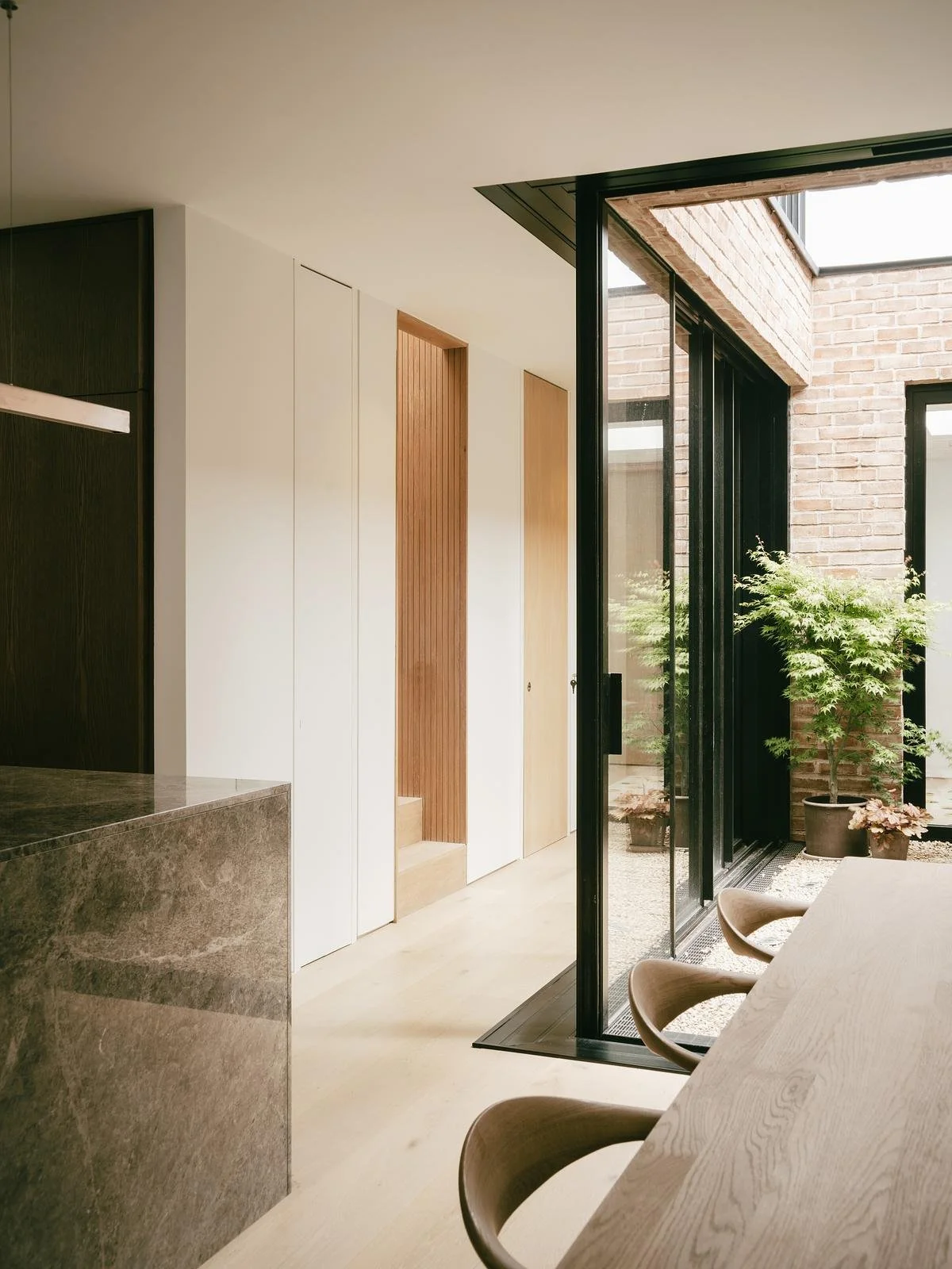 A limited palette of natural materials enhances the character of these illuminated spaces. Pale timber floors run throughout the home to create continuity, while oak joinery adds depth without overwhelming the architecture. The marble island introduces a tactile contrast that subtly grounds the living area. Brick surfaces in the courtyard nod to the building’s nineteenth-century origins, creating a meaningful dialogue between old structure and new intention. Rather than compete for attention, these materials quietly support the atmosphere created by the light that touches them.