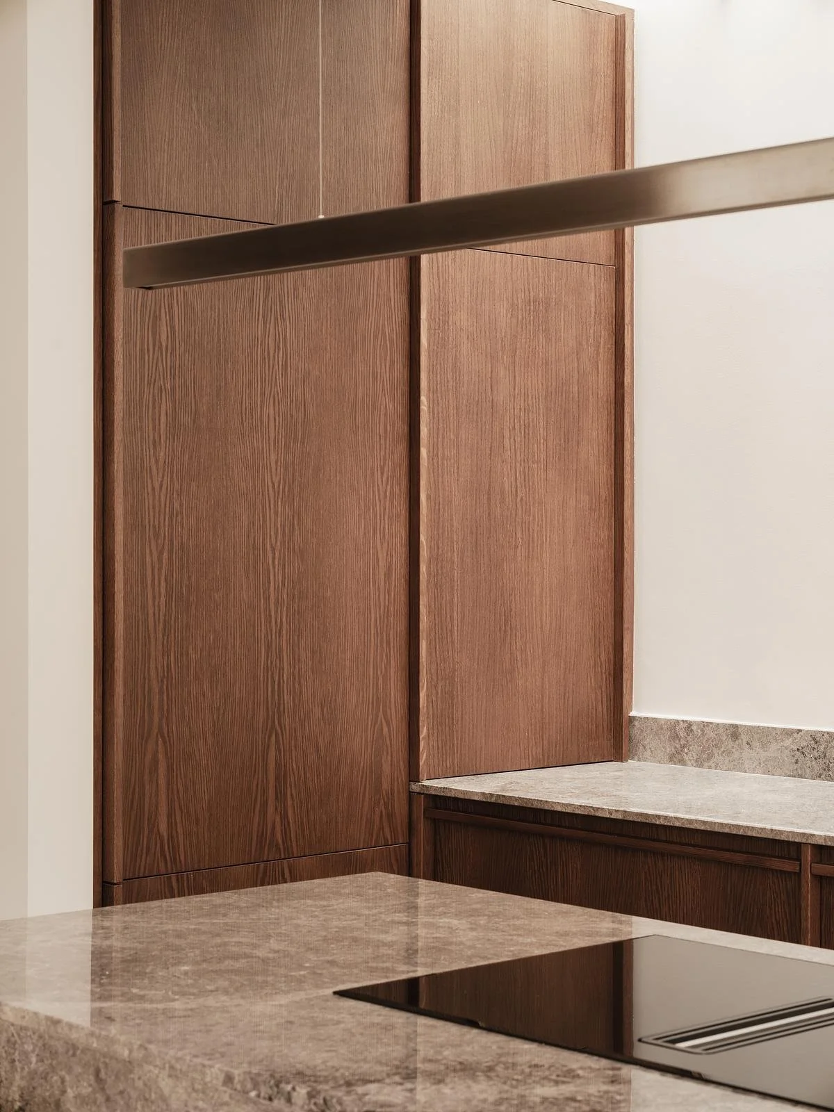 The tundra grey marble island anchors the kitchen as clerestory light slips along the oak cabinetry with an understated glow.